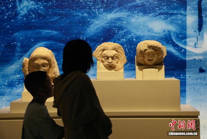 7月27日,参观者观看展出的石雕戏剧面具。正在四川省广汉市三星堆博物馆展出的“古希腊的旅程——希腊考古出土文物精品展”吸引了不少参观者。本次展览汇集了来自希腊31家博物馆和考古文博机构的172件/组珍贵文物(含9件复制品),全面展现了古希腊文明演进中的辉煌成就。中新社记者 王磊 摄