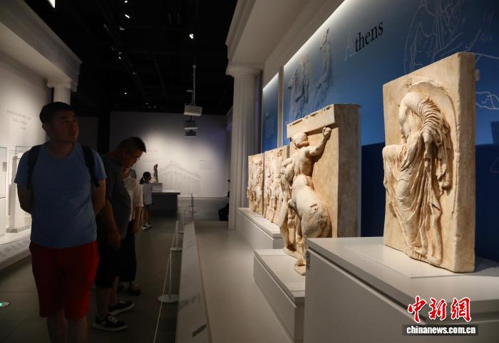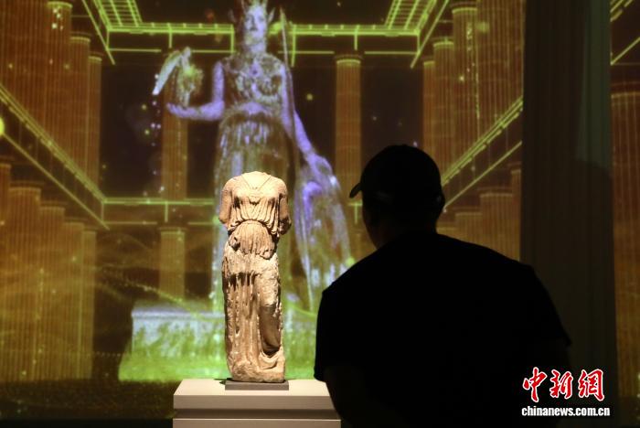 7月27日,参观者观看展出的雅典娜女神还愿雕像。正在四川省广汉市三星堆博物馆展出的“古希腊的旅程——希腊考古出土文物精品展”吸引了不少参观者。本次展览汇集了来自希腊31家博物馆和考古文博机构的172件/组珍贵文物(含9件复制品),全面展现了古希腊文明演进中的辉煌成就。中新社记者 王磊 摄