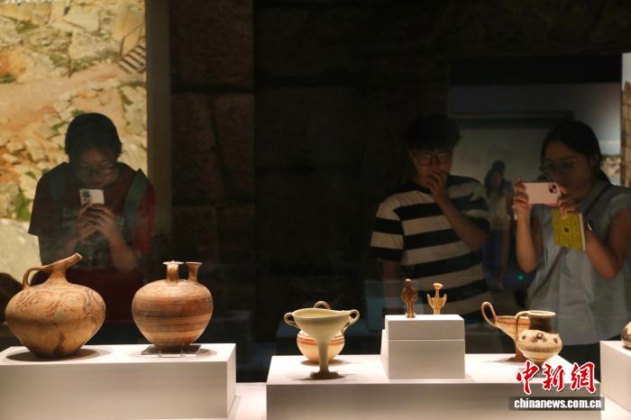 7月27日,参观者拍摄展出的陶器。正在四川省广汉市三星堆博物馆展出的“古希腊的旅程——希腊考古出土文物精品展”吸引了不少参观者。本次展览汇集了来自希腊31家博物馆和考古文博机构的172件/组珍贵文物(含9件复制品),全面展现了古希腊文明演进中的辉煌成就。中新社记者 王磊 摄