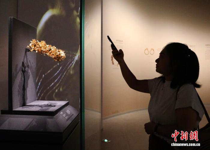 7月27日,参观者拍摄展出的金桃金娘花环。正在四川省广汉市三星堆博物馆展出的“古希腊的旅程——希腊考古出土文物精品展”吸引了不少参观者。本次展览汇集了来自希腊31家博物馆和考古文博机构的172件/组珍贵文物(含9件复制品),全面展现了古希腊文明演进中的辉煌成就。中新社记者 王磊 摄