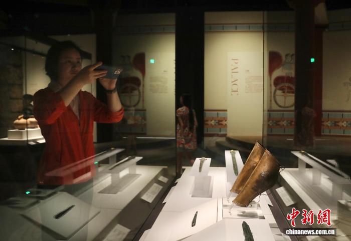 7月27日,参观者拍摄展出的一对青铜护胫甲。正在四川省广汉市三星堆博物馆展出的“古希腊的旅程——希腊考古出土文物精品展”吸引了不少参观者。本次展览汇集了来自希腊31家博物馆和考古文博机构的172件/组珍贵文物(含9件复制品),全面展现了古希腊文明演进中的辉煌成就。中新社记者 王磊 摄