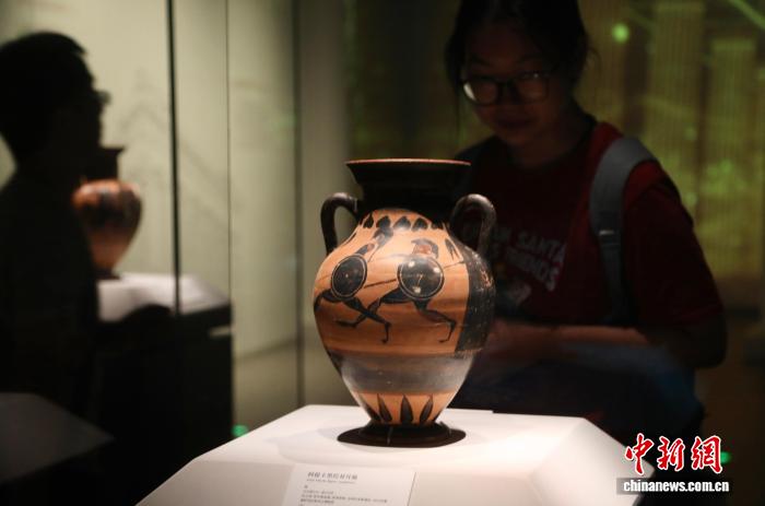 7月27日,参观者观看展出的阿提卡黑绘双耳瓶。正在四川省广汉市三星堆博物馆展出的“古希腊的旅程——希腊考古出土文物精品展”吸引了不少参观者。本次展览汇集了来自希腊31家博物馆和考古文博机构的172件/组珍贵文物(含9件复制品),全面展现了古希腊文明演进中的辉煌成就。中新社记者 王磊 摄