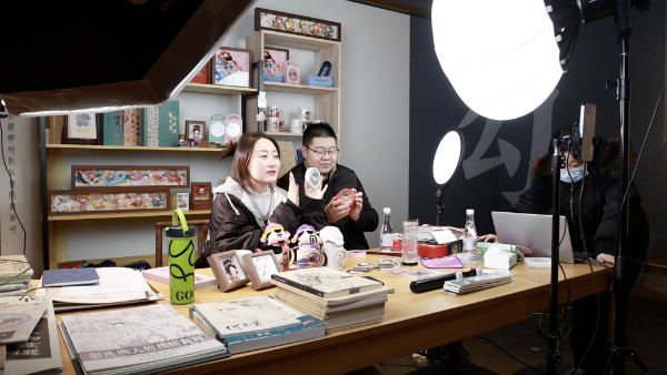 水印工作室内,记者亲手体验年画拓印——颜料均匀涂抹,纸张轻压揭起,马年吉祥图案跃然眼前,传递前程似锦的美好期盼。步入彩绘工作室,经典年画形象“娃娃抱鱼”正被晕染上明快色彩,成为贴合年轻人审美的新潮文创。直播间里,主播们热情推介马年台历、立体纸雕等新品,老字号通过屏幕圈粉年轻消费者。