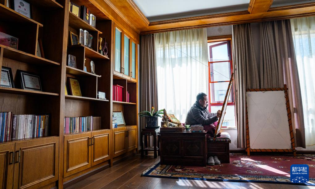2月10日,罗布斯达在西藏唐卡画院的展厅里观赏自己的唐卡作品。