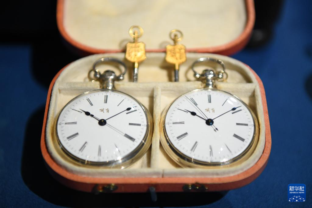 这是4月12日在瑞士拉绍德封的国际钟表博物馆内拍摄的一对播威品牌怀表。这对怀表大约制作于1880年,是当时向中国出口的款式,寓意“成双成对”。