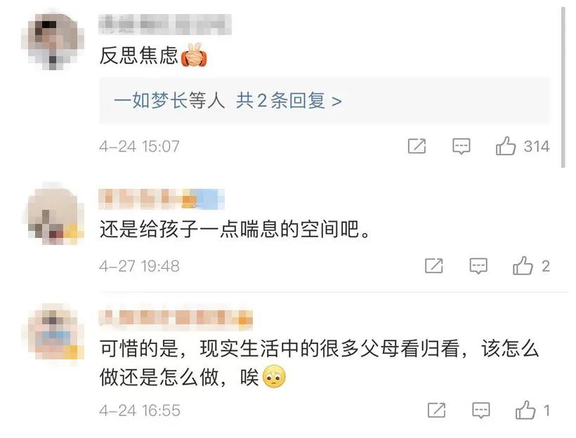 也有不少观众表示剧中的矛盾和戏剧冲突过于集中,紧绷的剧情让他们感到“窒息”“紧张”“透不过气”。“看过剧后立刻被剧中充斥的焦虑气氛感染,隔着屏幕都感到紧张 ”“小孩焦虑,大人焦虑,这部剧让大家一起焦虑”等。