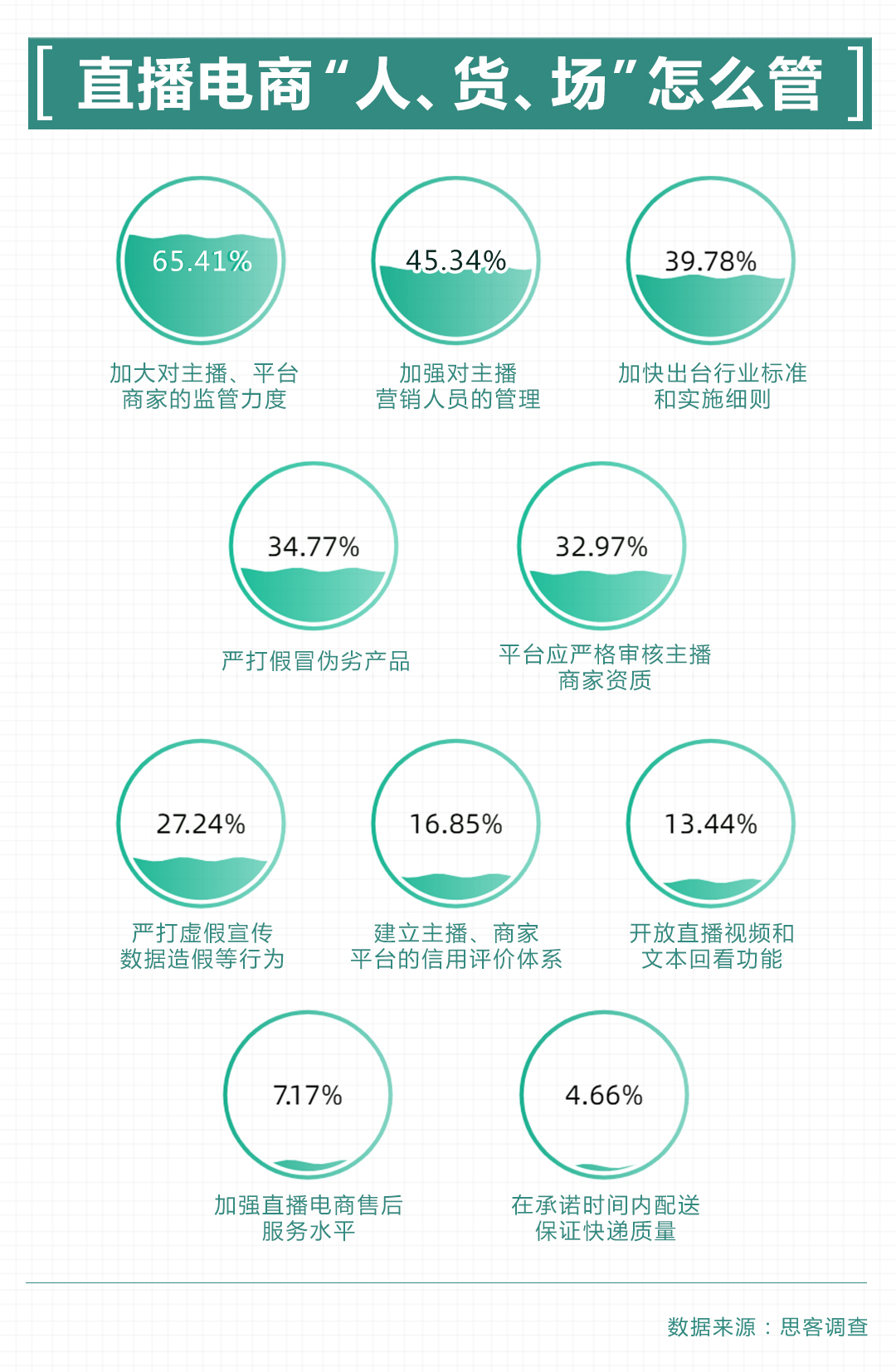 通过思客调查,我们也能看到消费者对规范直播电商的呼声与期待。调查显示,65.41%的受访者提出有关部门应加大对主播、平台和商家的监管力度。45.34%的受访者表示电商平台在获取利益的同时,尤其要强化对入驻商家和主播的规范约束。