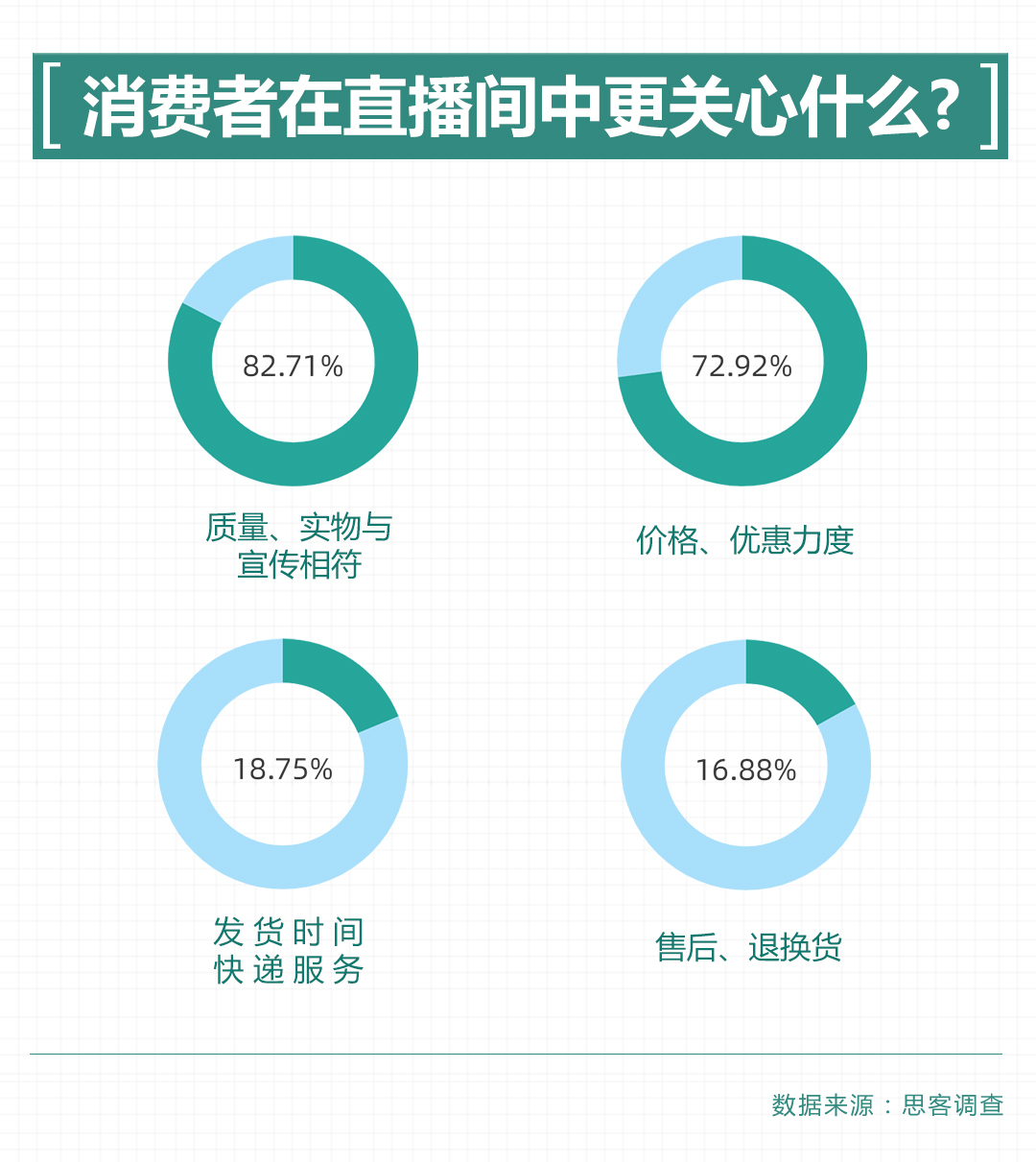 虚假宣传、刷假单诱导消费等现象屡被诟病。思客调查显示,65.59%的受访者认为最应关注直播电商存在的虚假或夸大宣传问题。54.30%的受访者认为应关注直播电商存在的诱导过度消费问题。百万在线、流量过亿、爆款秒杀……使用“极限词”诱导消费者冲动消费受到网民诟病。在个别平台中,甚至出现刷假单、雇水军等情况。