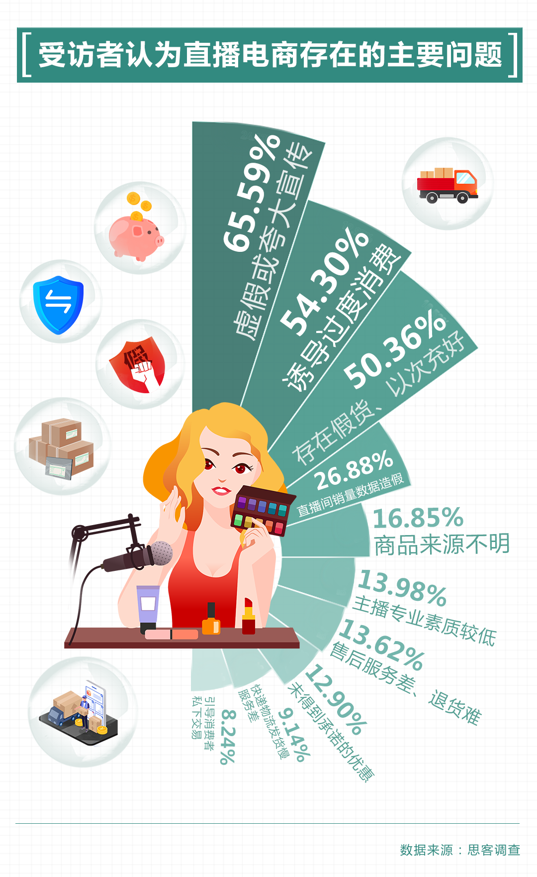 假冒伪劣、以次充好问题时有出现。思客调查显示,50.36%的受访者表示直播电商中存在“假货、以次充好”问题。去年前三季度,全国12315平台“直播”相关投诉同比增长479.60%,其中与“直播带货”相关的诉求占比近六成。有受访者称,自己遇到过“直播展示的是真的,然后给我发一个假的”“2元一瓶的抑菌洗手液其实是‘三无’产品”等情况。