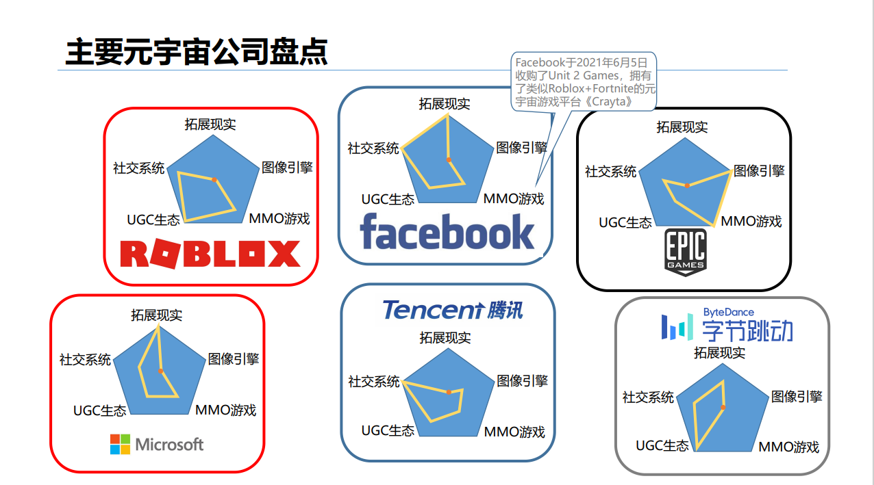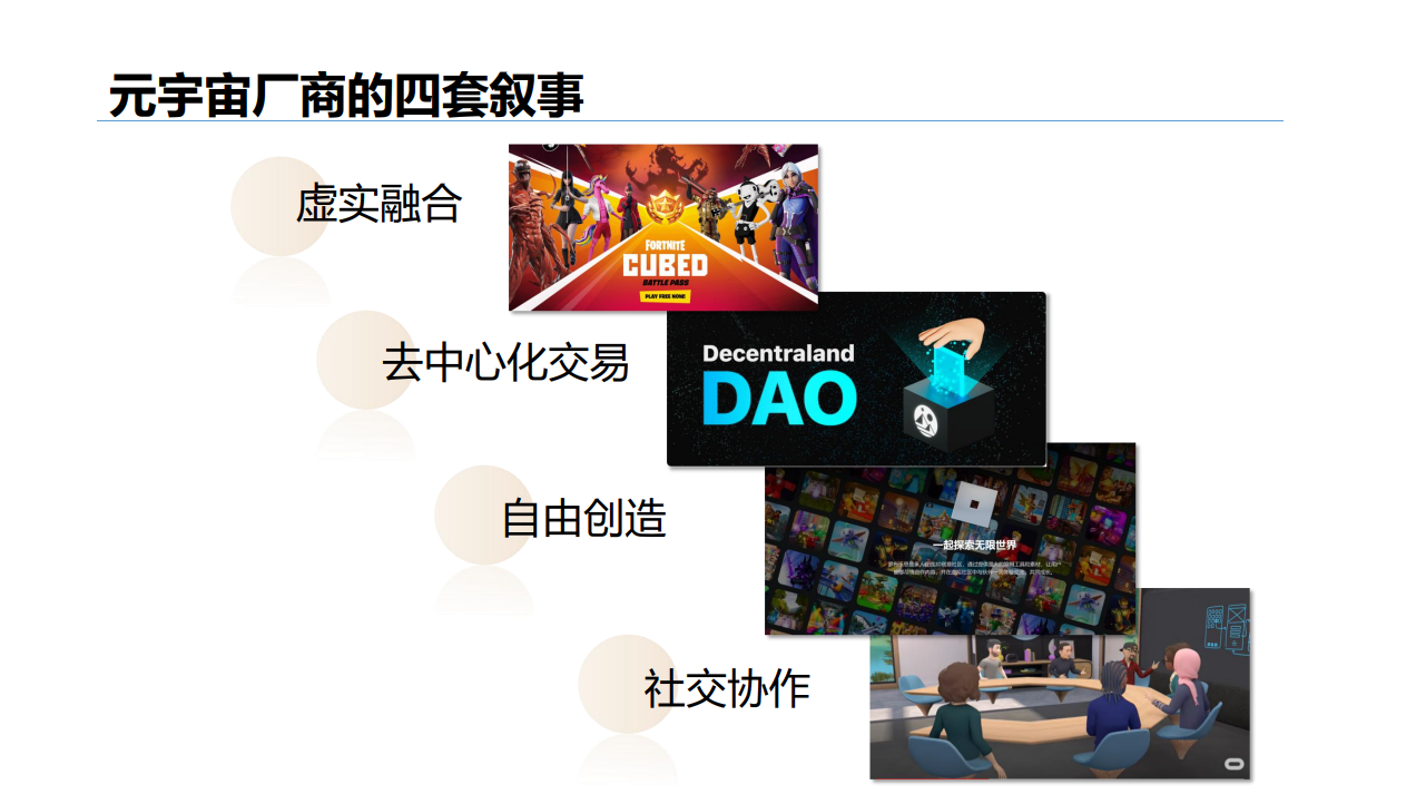 我们看到目前市场上的元宇宙公司有四套叙事逻辑,分为虚实融合、去中心化交易、自由创造、社交协作,因为每一家公司的特点不一样,所以元宇宙市场上最终会是百花齐放的格局,满足用户不同的需求。