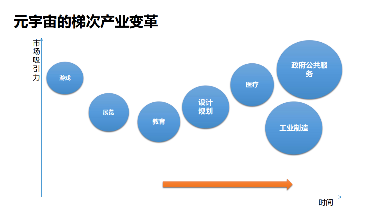 元宇宙在不同产业领域当中,发展速度是不一样的,如果某一个产业领域和元宇宙的三个属性有密切结合,它发展会更快,这包括游戏、展览、教育、设计规划、医疗、工业制造、政府公共服务等。未来我们所有的行业都需要在有空间性、人机性、经济增值性的元宇宙当中重新进入赛道。