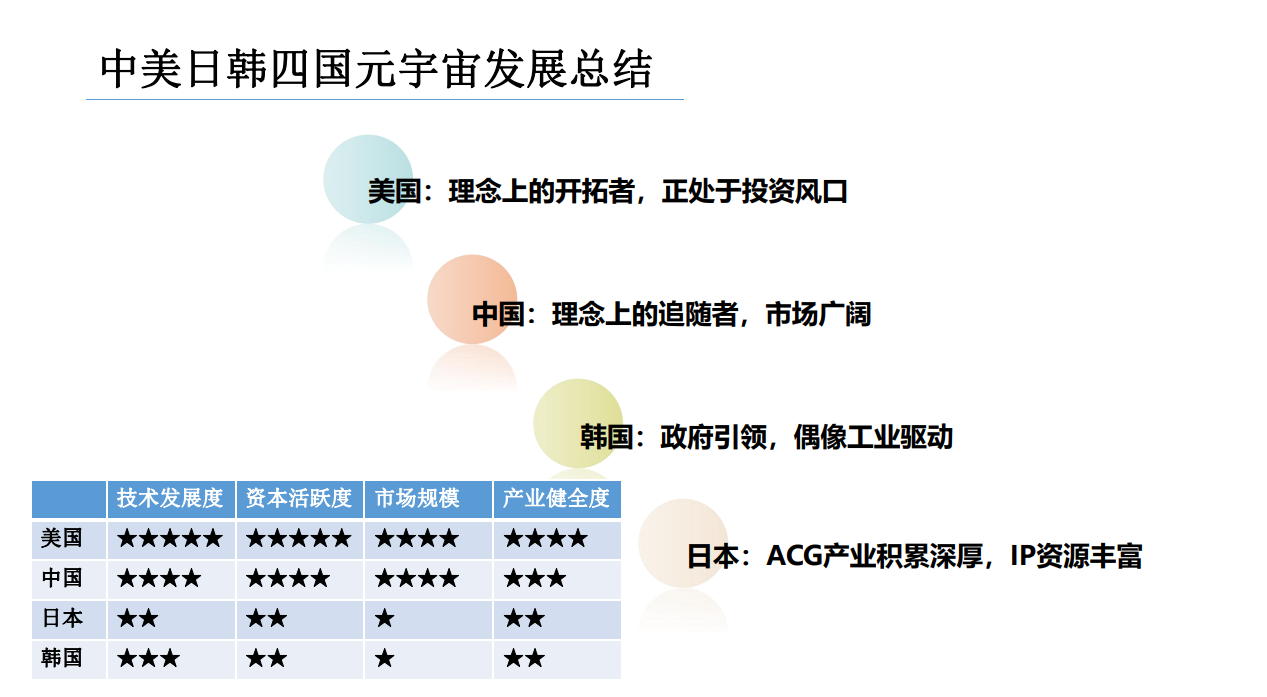 总结一下中美日韩四个国家,美国发展的速度是比较快的,Roblox已经上市,我们要做出Roblox这样的游戏平台,同时还要上市,至少需要三年时间,这也意味着我们在手机上的元宇宙比美国至少落后三年。