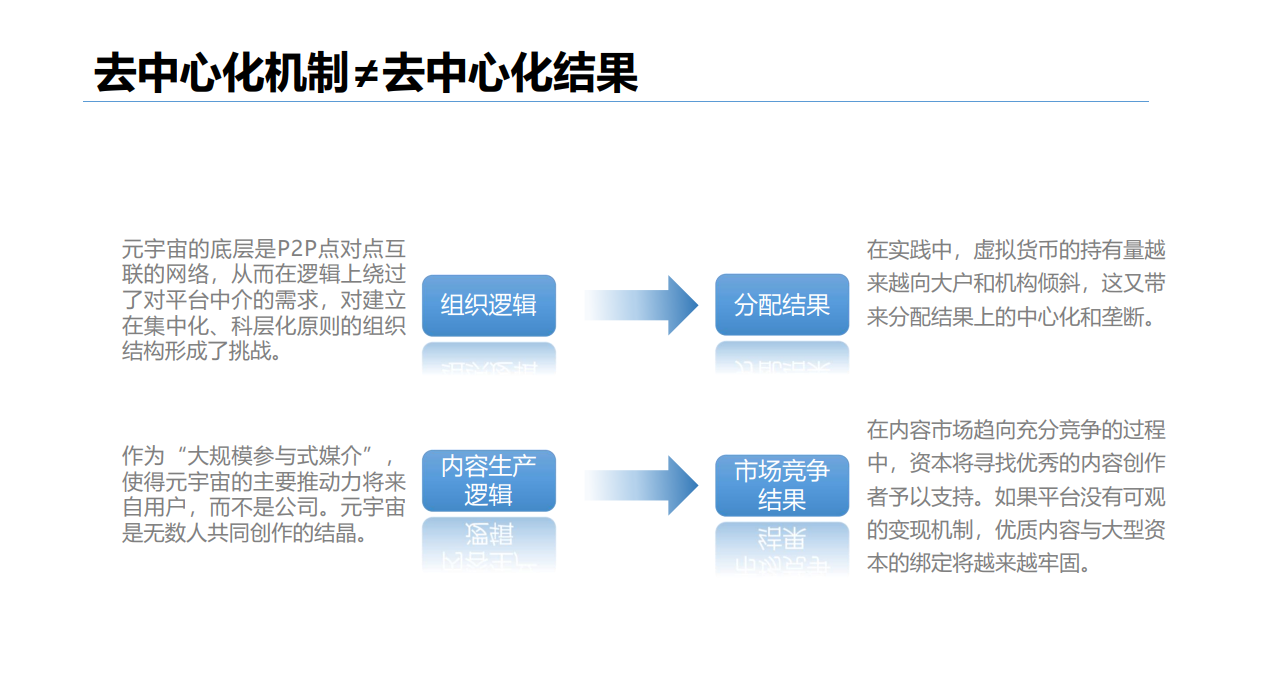 去中心化机制≠去中心化结果。很多公司在设计元宇宙时,都强调自身是去中心化的,但是由以前互联网的发展历史来看,没有哪一次互联网的发展造就的是去中心化的结果,最终都是在中心化的,我们大部分人是集中在若干个平台里面的,平台形成了更强的数据洞察能力,从而实现了平台垄断和大数据杀熟。