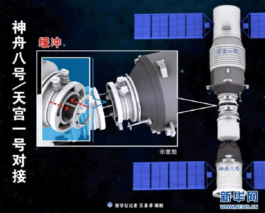 高速飞行的大质量航天器,即使以较小速度相互接触,冲击能量也是相当可观的。飞船和空间站中至少一方需要配置缓冲和耗能装置,减缓冲击过载,耗散或吸收撞击能量。