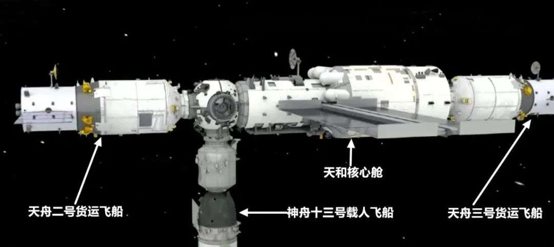 天和核心舱前向、后向、径向端口上对接的飞船示意图。来源:36kr