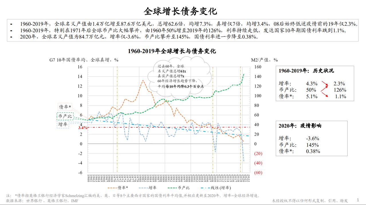 今天受邀参加新华网思客年会,探讨新格局、新优势和新篇章,特别是在“双碳”大考下的产业机遇与挑战。经济增长是大家一直关心的问题,我们看一下过去世界经济60年的发展,可以看到经济总体上还是保持了一个平稳的3.4%左右的增长,但是也确实有一个长期的向下趋势。同时世界经济的债务也是越来越高,从经济的货币与产值的比较来看,可以看得出不断在攀升,这是对我们增长的一种挑战。