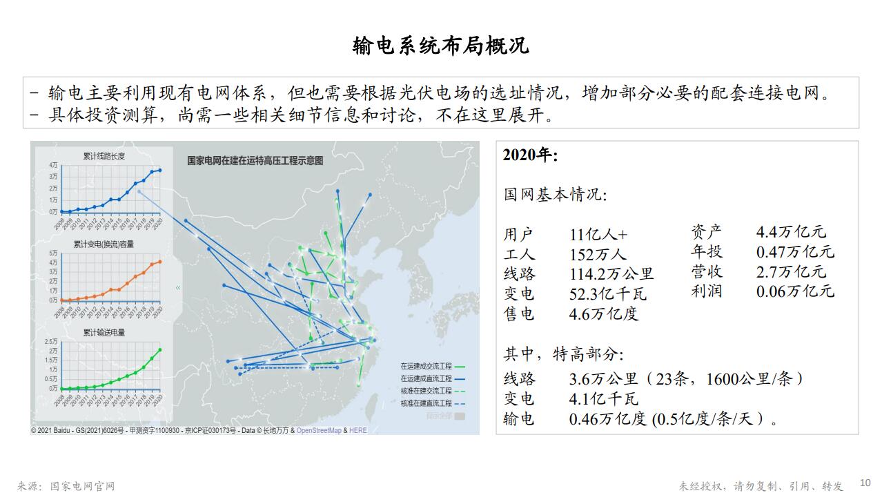 除了刚才讲的储电问题,未来还有一个输电问题。输电基本上可以尽量利用现有电网,但也需要根据光伏电场的选址情况,增加一些必要的输电线路。具体的输电线路的投资测算还需要一些细节信息和讨论,就不在这里展开了。总而言之,输电体系基本上可以最大限度地利用现有电网体系。光伏发电可重新再造新的电力行业,从发电到输电到储电,基本上是可以解决的,这是非常好的。光伏产业是一个新的发展机会,对电力系统来讲,也是一个转型的具体案例,能够从过去旧的、高碳高耗的形式,变成了新能源、低耗的形式。好,我今天就先讲这样,谢谢大家。