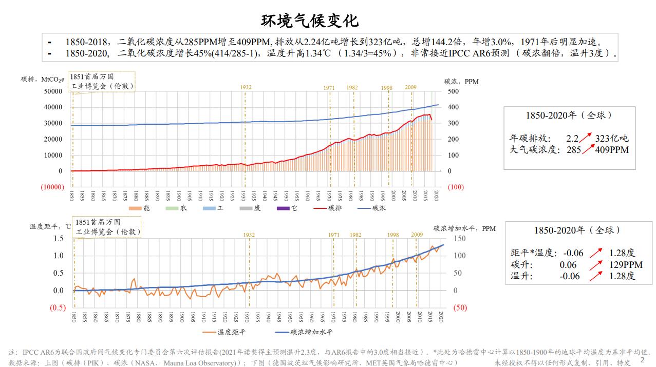 另外一个是环境的挑战。环境和气候的变化,这里有一个历史的观测记录,从1850年开始到现在,170多年,看到全世界的碳排放不断在增加,从最初的每年2.2亿吨碳排放到现在的323亿吨,所以对环境产生很大的压力。同时也可以看到,同时期观测到的地球二氧化碳的含量也是不断在攀升,从原来的285PPM到现在的409PPM。下面这张图可以看出,随着碳浓度的增加,相应的全世界的平均气温也在增加,几乎跟大气碳浓度水平是同步的,这样的气候产生的严重结果就是天气灾害频发,这是环境的挑战。