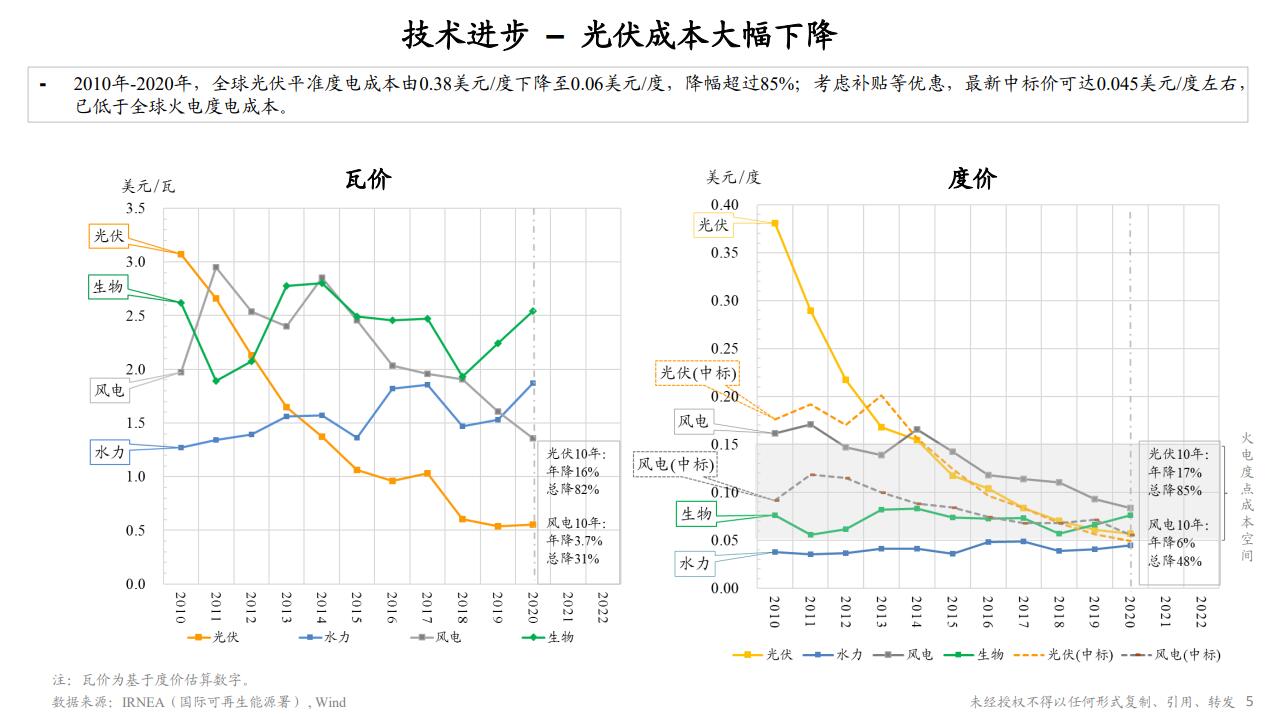 再看新优势,就是技术进步使得光伏成本大幅下降。在过去的十年,光伏的度电价格降幅超过85%。左图中每瓦的光伏装机的价格有一个很大的降幅,然后看右图中光伏每度电的价格也有了大幅度下降,这也是在几种不同的可再生能源类别中成本降幅最快的,这样的话就大大提升了光伏的经济可行性。