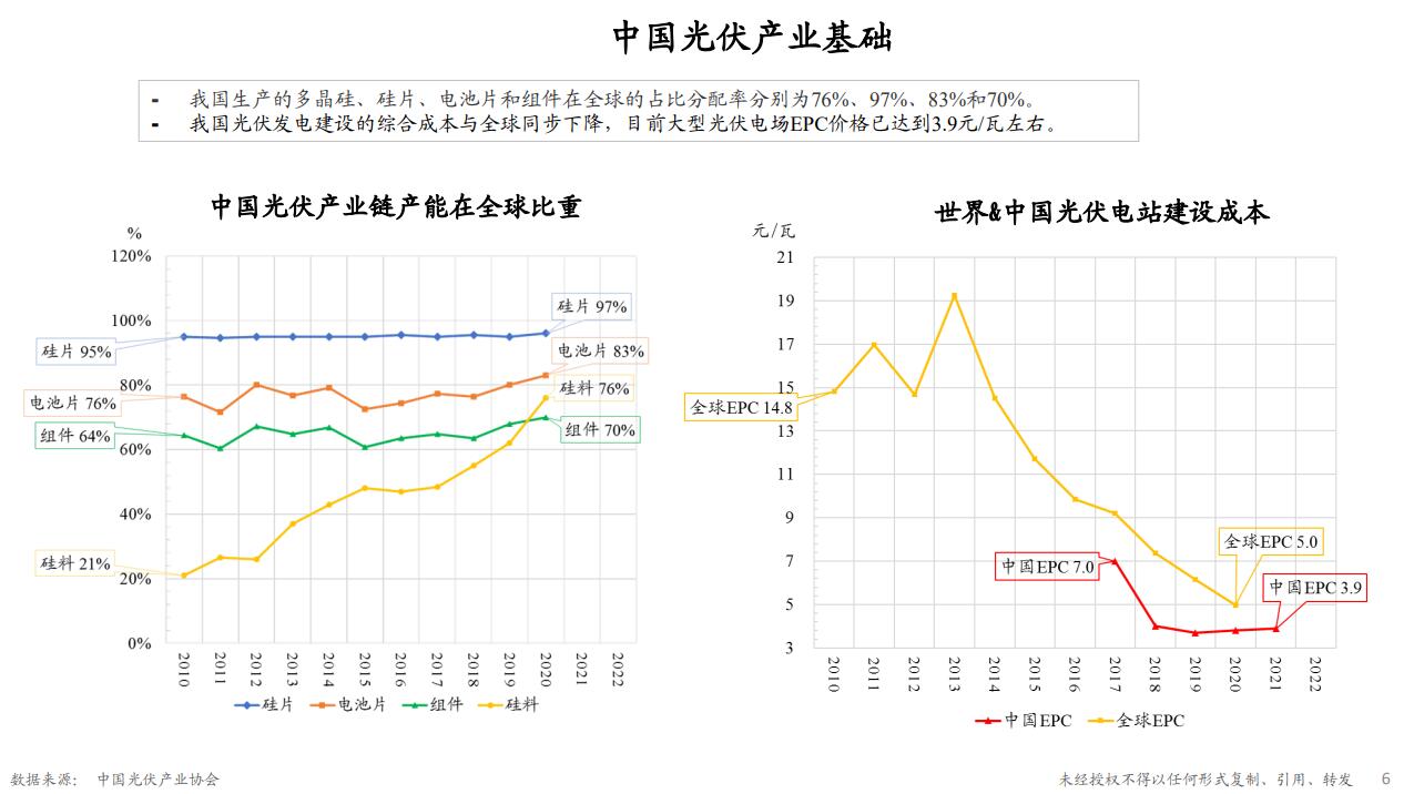 同时可以看一下中国的光伏产业基础。从下面的左图可以看出来,中国光伏产业链的各个环节在全球占据了很大的比重,包括硅料的生产也是在迅速提升。看右边这张图,中国光伏电站建设成本也是系统性下降,同时显著低于全球的成本水平。