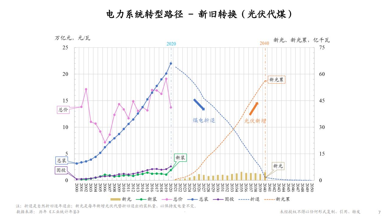 下面我们谈一下,如果经过进一步论证,证明光伏能源作为一个可再生能源,有足够大的规模可以替代煤炭做能源的基础,我们应该怎么转型?下面这张图上左边这一半实际上是2000年到2020年整个电力企业的装机总量在不断累积增加,今天大约有70%的发电还是用火电的技术设备。那么面向未来,我们可以怎么调整?这就是一个转型路径的问题。在这里我们有一个策略,这些煤电既然已经建了,那么就让它在工作寿命期持续工作,随着时间推延,每年会有折旧的、退役下来的,那在新增的发电能力上,就不再做传统电源的投资,而是把新的投资都集中在光伏类型的新能源,这样就会每年有一个逐渐等量替换的概念。同时如果有新的经济增长需求,光伏的投资根据实际情况也可以略微增加,这样的话就可以用大概20年完成一个自然的能源转型,最终实现用光伏来替代煤炭,实现我们的“双碳”目标。