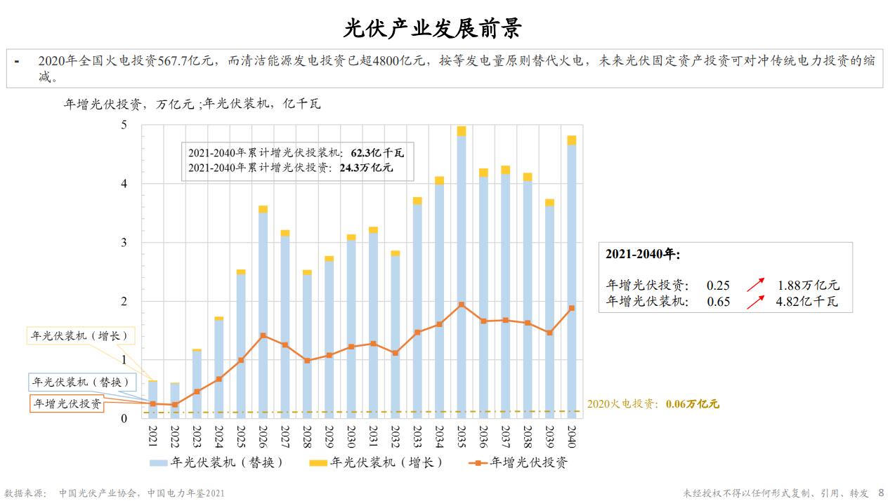 按照刚才的演进路径,光伏产业投资假如从2021年开始,新增的电源都是由光伏装机来实现,那么下面这张图就展示了未来的20年的一个投资逐渐增加的过程,从开始大概0.25万亿,到后来大概2万亿的年投资,整个全过程完成约20年,总共的投资规模大概是20多万亿元。