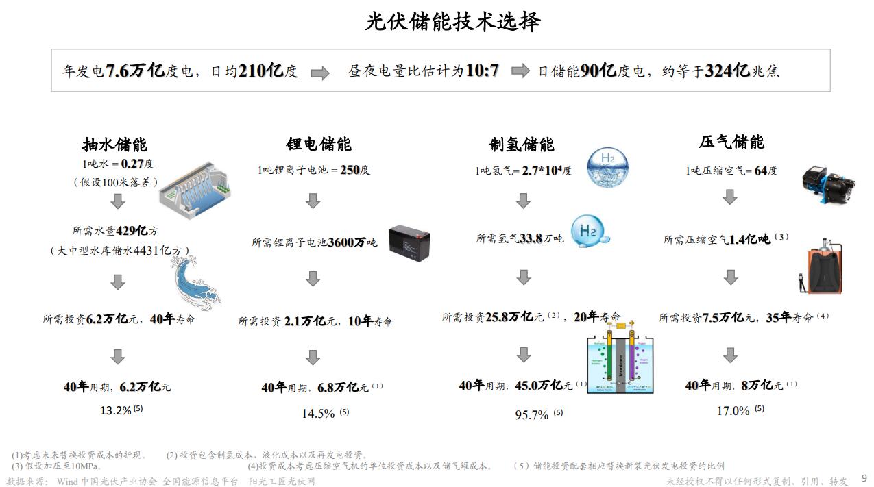 刚才讲的是光伏发电的可能性,但光伏发电有两个重要的相关问题,还需要进一步的论证和研究来解决。这里做了一个基本测算,根据发电系统,我们现在一年发电7.6万亿度电,折成每天的话应该是210亿度,如果换用光伏,即使白天能够发这么多,但需要有一个储电体系以解决晚上用电的需求,储电大概需要90亿度。如果要储这么多能量的电,现在有几个选择:一个是最简单的抽水储能,有一个估算,如果要建立一个90亿度的储电能力抽水蓄能设施的话,需要6.2万亿的投资;一个是锂电储能,需要6.8万亿的投资;还有一个是用电解制氢,制氢以后,再通过氢发电进行存储和释放能量的过程;最后一个是压气储能,投资大概总额也要8万亿左右。比较下来抽水蓄能、锂电储能和压气储能可以控制在8万亿左右,这个价格占发电系统投资的比例大概是20%左右。从经济的投资测算角度来讲,也是占比适当,不算很高。