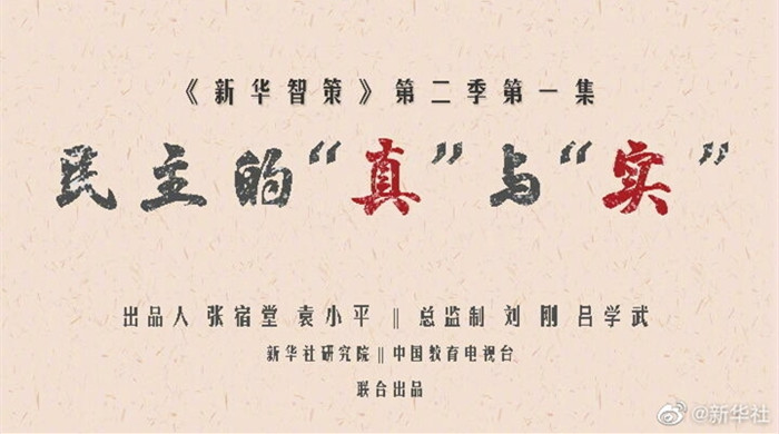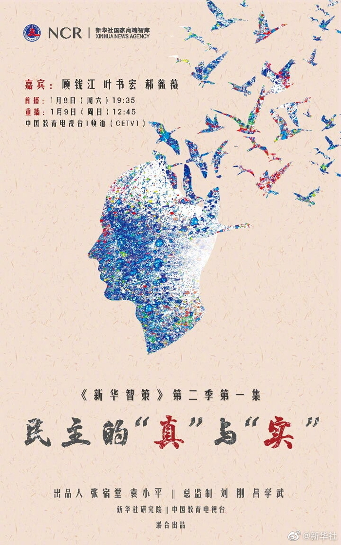 新华社国家高端智库与中国教育电视台联合制作的高端智库访谈节目《新华智策》第二季开播,首期特别节目《民主的“真”与“实”》于8日在中国教育电视台一频道(CETV-1)黄金时间播出。