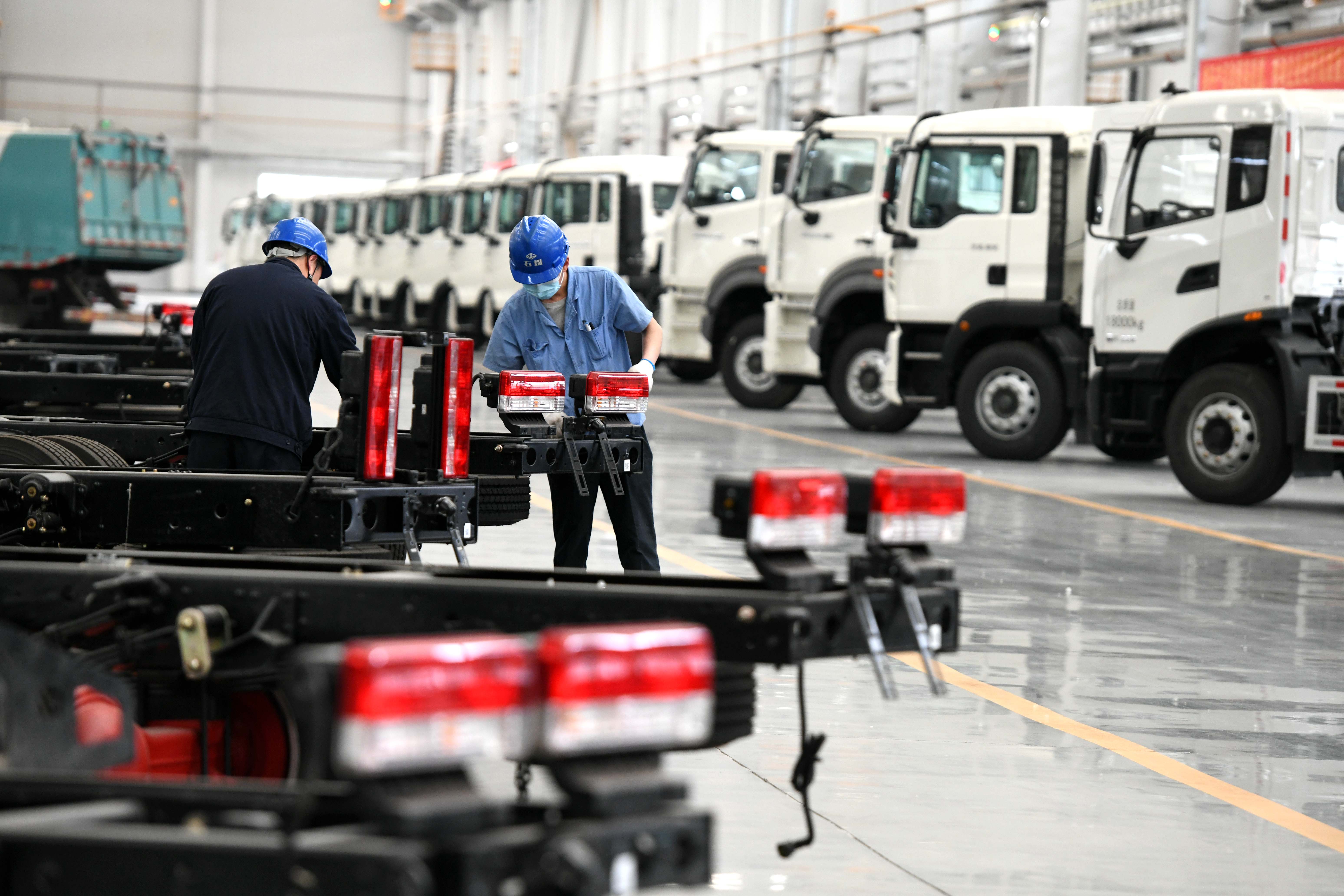 车间内,工作人员在组装新能源环卫车。新华社记者 李继伟 摄