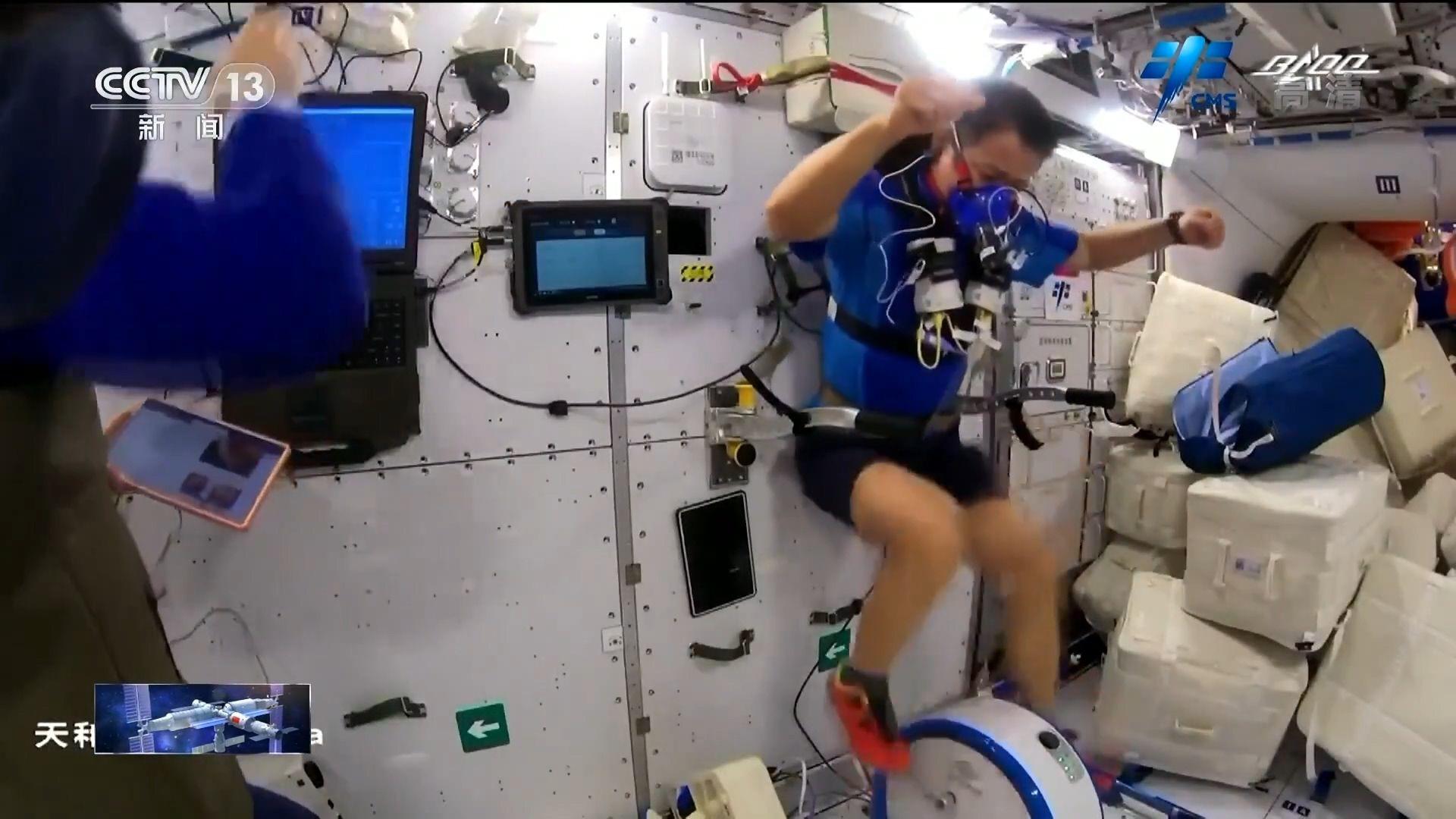 ——锻炼设施。舱内配置了跑步机、自行车等固定的锻炼设施,航天员也配备了拉力器等便携式锻炼器材和阻抗锻炼装置。科学的在轨锻炼帮助航天员保持体能和身体机能,对完成在轨任务和返回地面的恢复都有益处。