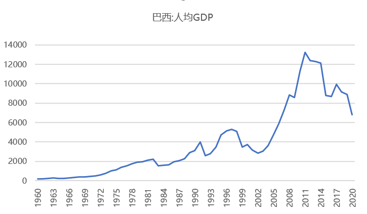 从这张图中我们可以看出,早在上世纪七八十年代,巴西就已经成为了一个中等收入经济体,并且早在2011年,也就是大概10年前,就已经迈过了高收入经济体的门槛,这也是为什么巴西会成为金砖国家之一的重要原因。当时,巴西的经济增长前景被外界普遍看好,但非常遗憾的是,好景不长,没过多长时间人均GDP几乎下降了一半,跌落到“中等收入陷阱”当中。我们可以看出从2012年到2021年,人均GDP几乎下降了一半,至今没有看到恢复的迹象。我们不禁要问,过去这样具有着一个惊人增长速度的国家,为什么会出现这种情况呢?