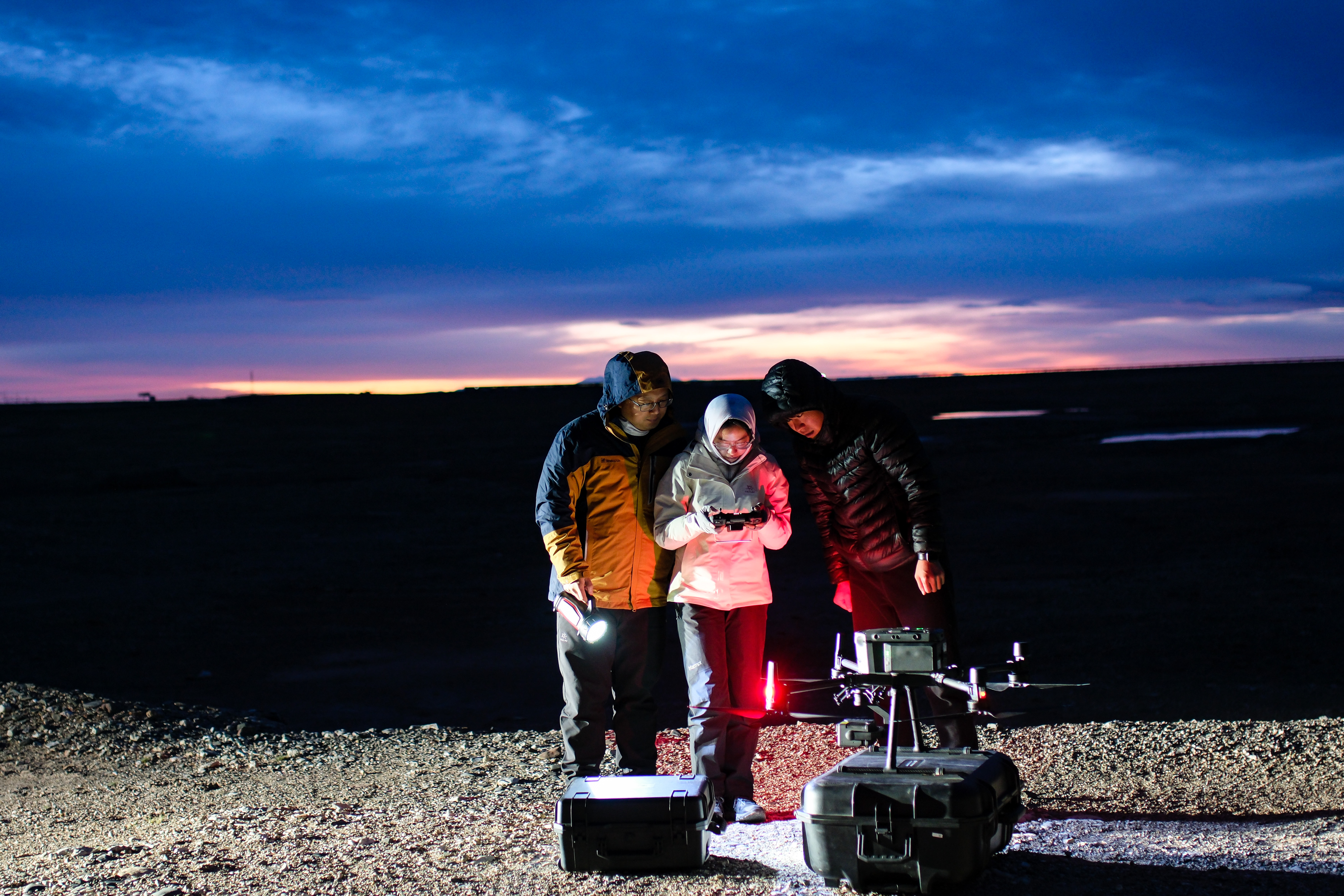 6月16日凌晨,中国科学院西北高原生物研究所的连新明团队在青藏公路楚玛尔河大桥附近监测藏羚羊迁徙途中的夜宿地。新华社记者 张铖 摄