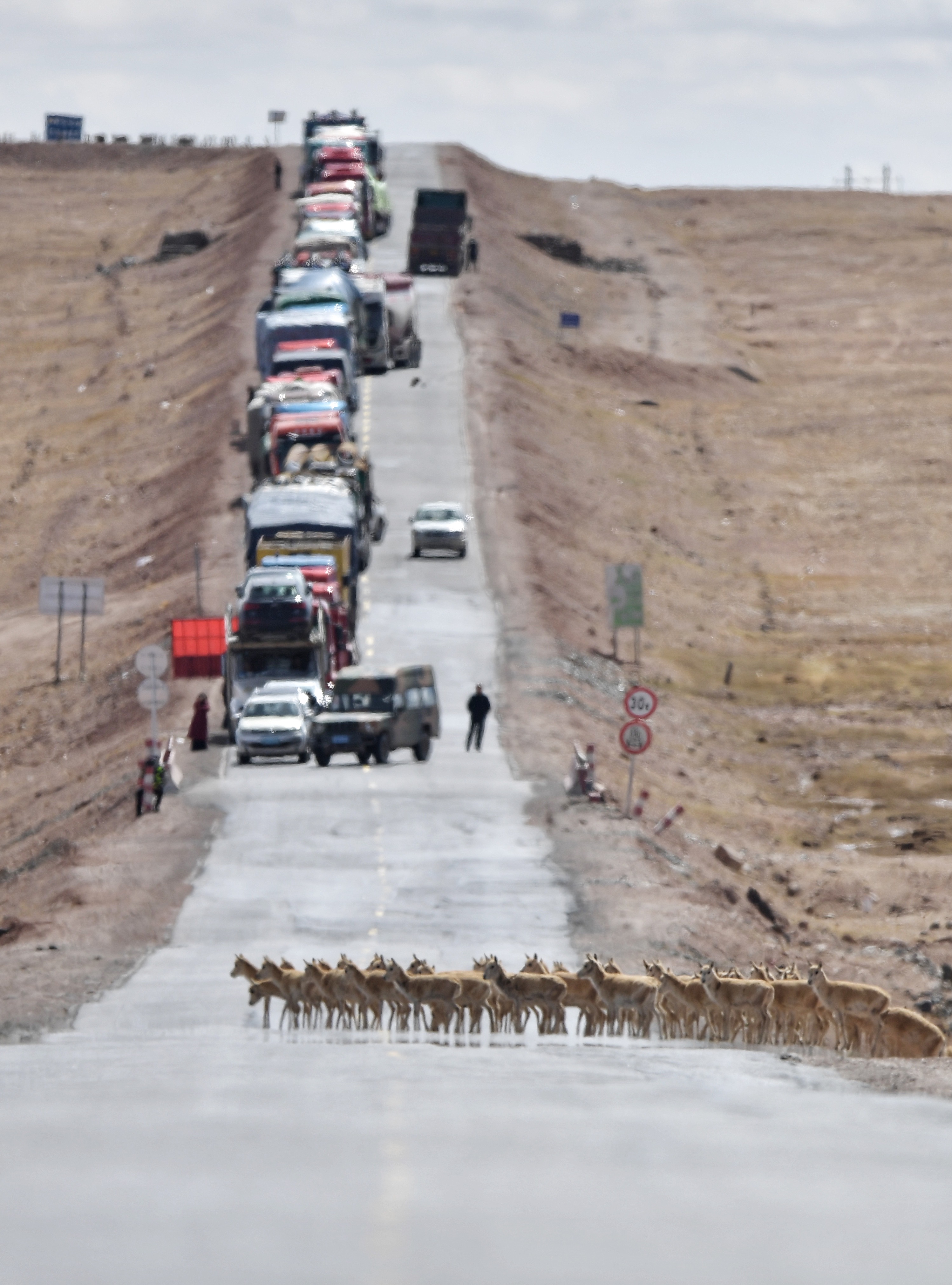 迁徙藏羚羊群经过青藏公路可可西里五道梁路段。