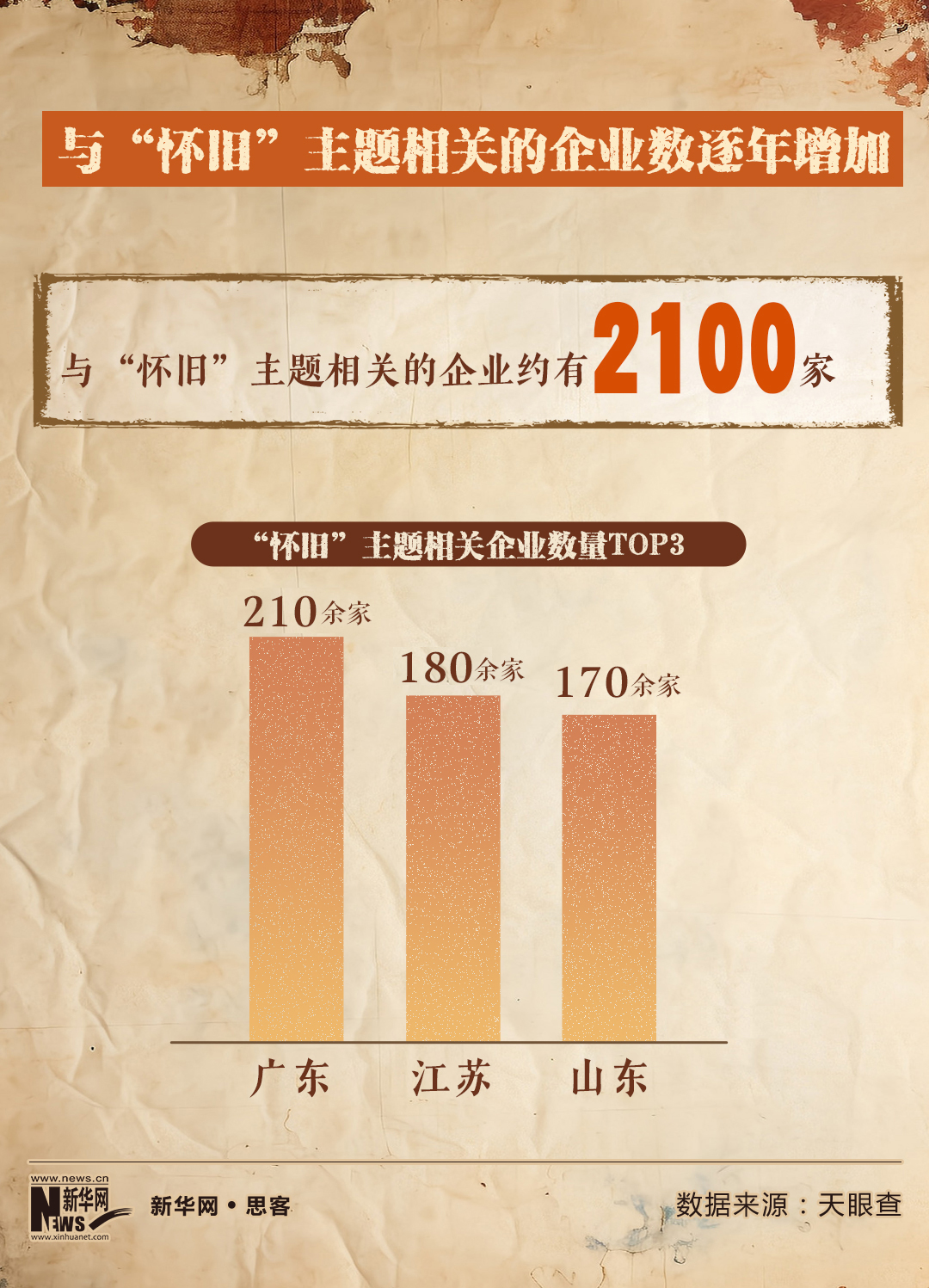 天眼查数据显示,与“怀旧”主题相关的企业约有2100家,其中,广东、江苏以及山东所拥有的企业数量位居前列,分别拥有210余家、180余家以及170余家;从成立时间来看,成立于2000年之前的相关企业拥有20余家。