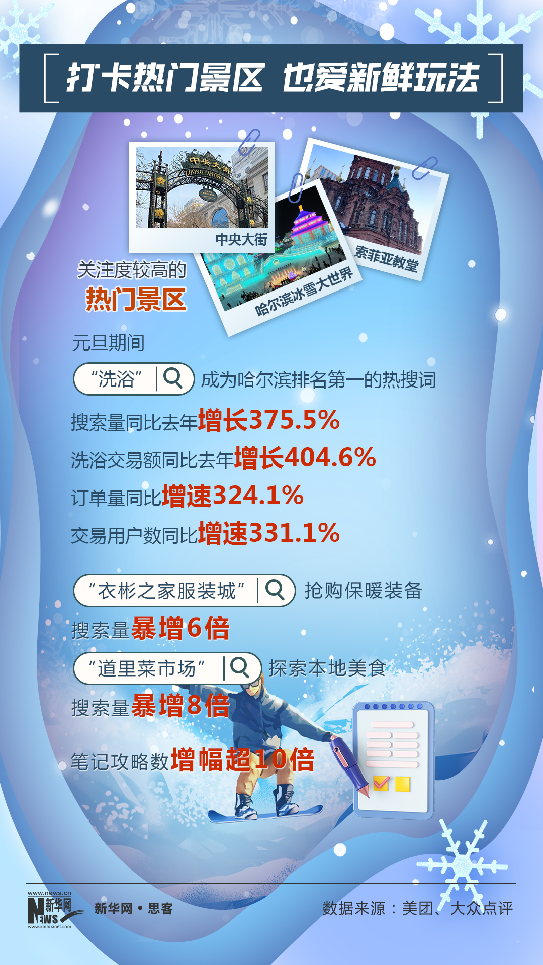 这个冬天,哈尔滨火了。机场玩快闪花样迎客、索菲亚教堂前用无人机升起人造月亮,松花江上放飞热气球……凭借东北式的特色和好客,哈尔滨成为元旦热门旅游城市中的一匹黑马,累计接待游客304.79万人次,实现旅游总收入59.14亿元。哪里的冰雪旅游爱好者最爱闯哈尔滨?他们都在玩什么?哪些景点和美食最受欢迎?