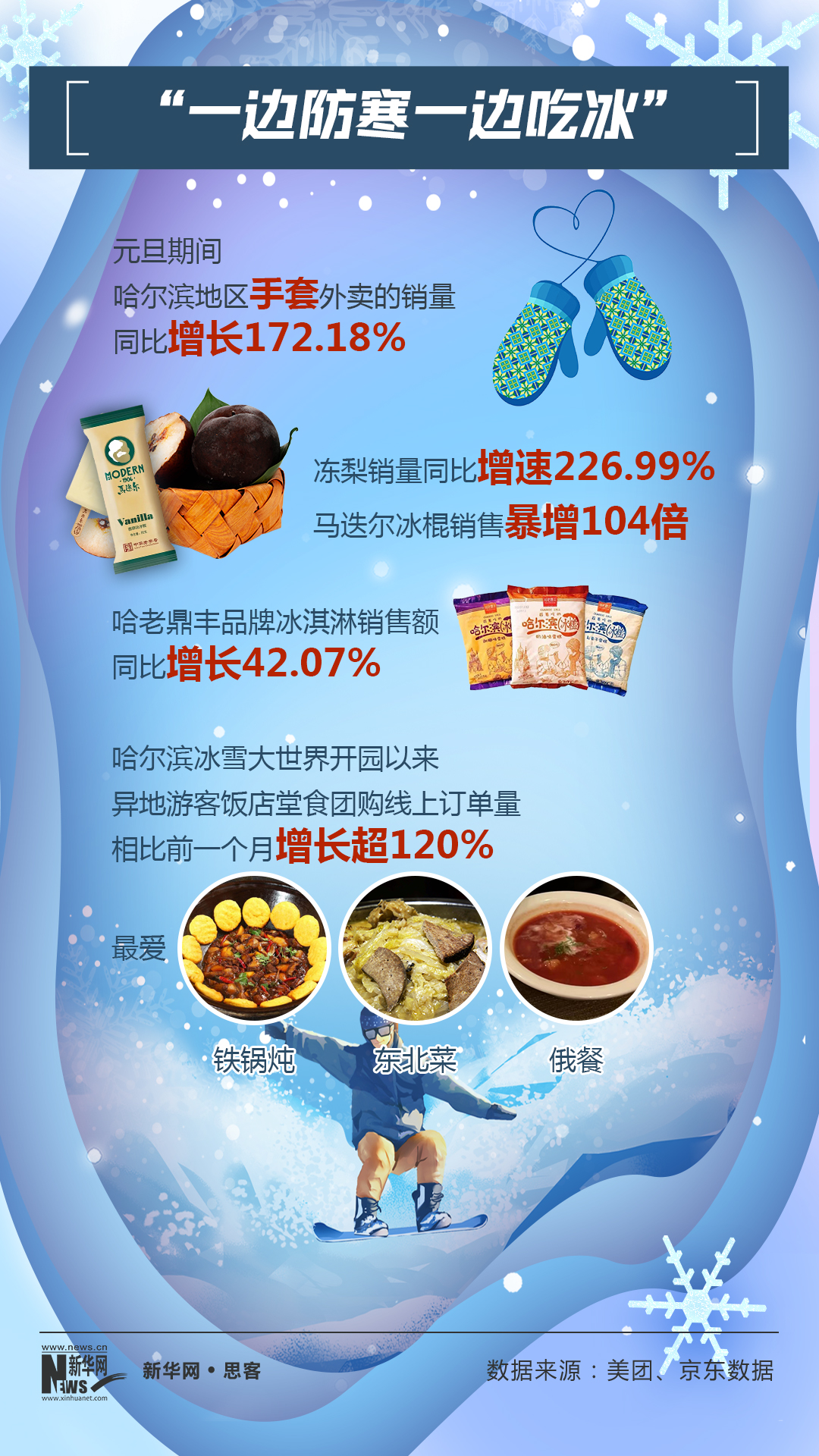 哈尔滨冰雪大世界开园以来,外地游客贡献的饭店堂食团购线上订单量相比前一个月增长超120%。除了铁锅炖、锅包肉等特色东北菜,独具哈尔滨特色的俄餐厅门口也大排长龙。马迭尔冰棍销售暴增104倍,哈老鼎丰品牌冰淇淋销售额同比增长42.07%,“一边防寒一边吃冰”成了游客们在哈尔滨的“冰火两重天”。