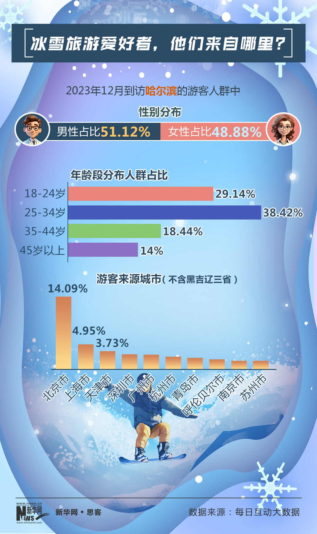 每日互动大数据显示,在12月份到访哈尔滨的游客中,男性占比51.12%,女性占比48.88%。