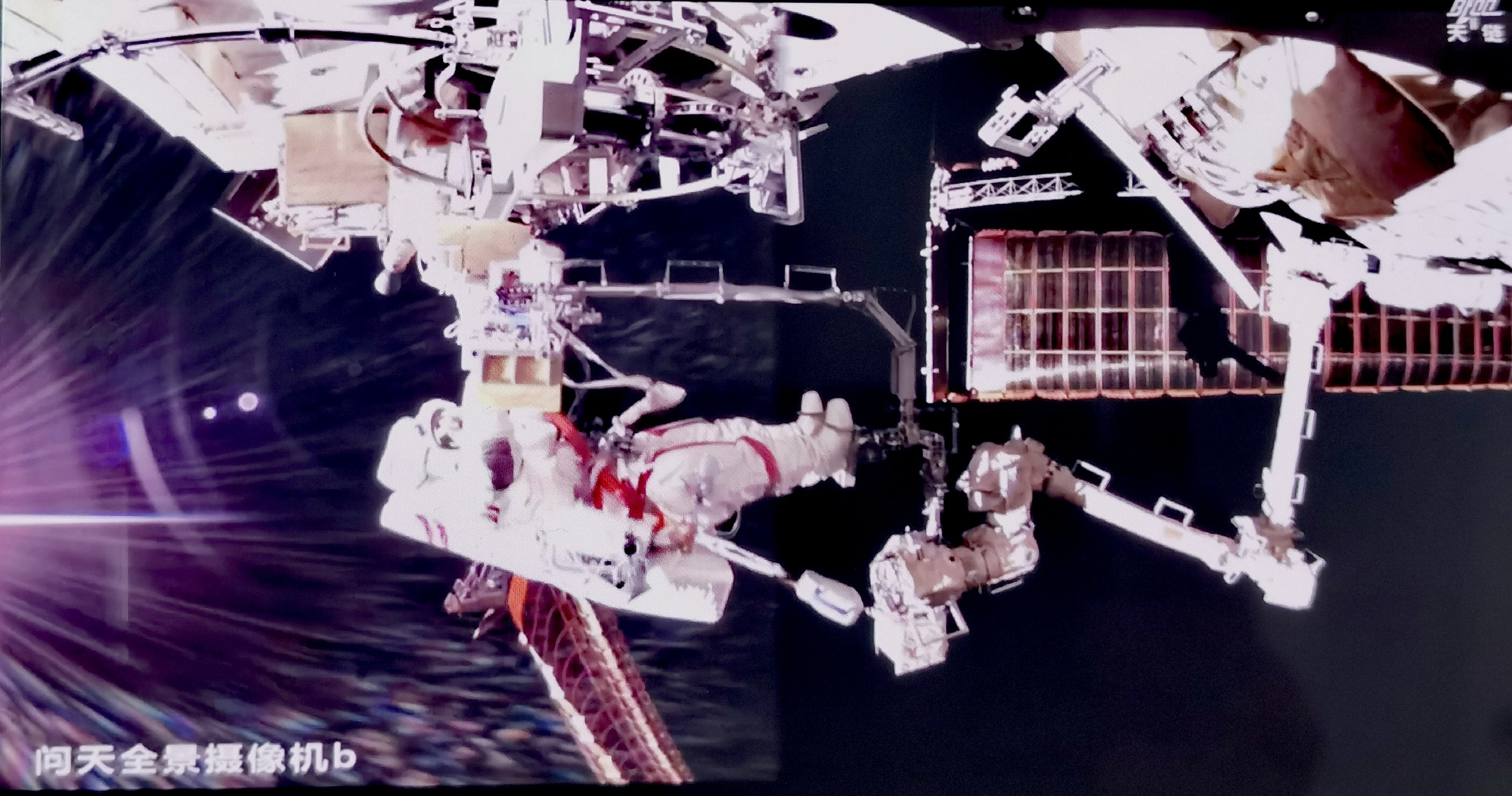 ▲机械臂与神舟十七号航天员协同执行出舱任务(图源:中国载人航天)