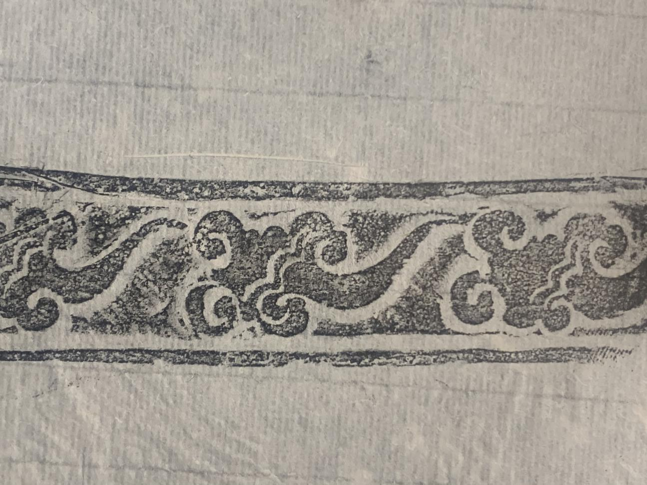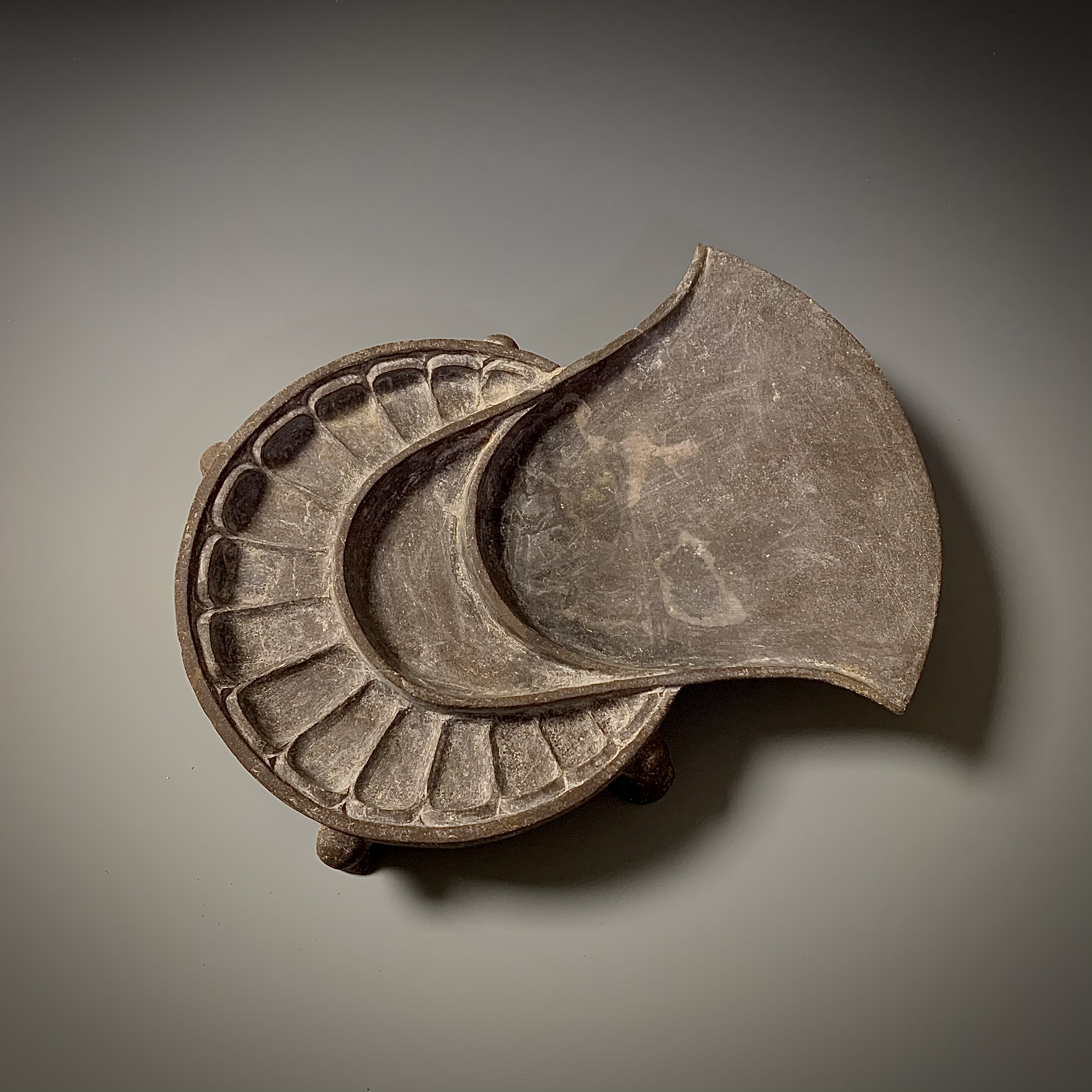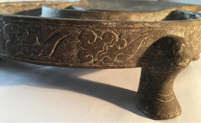 云纹是我国传统装饰纹样中典型的祥瑞图案,其造型藴涵着古人信仰和审美,赋予吉祥如意的美好寓意,所以也称如意云纹。云纹的形态和内涵随着时代的变化而演变,造型从浪漫灵动到精致复杂,从抽象到具象,被广泛装饰在青铜器、建筑、服饰以及各类器物上。商周云雷纹源于古代天圆地方的宇宙观;秦汉的勾云、卷云纹寄托了羽化升仙和长生不老的载体;魏晋到隋唐的佛教兴盛,云纹的使用更加频繁,这时出现的朵云更加写实,柔软多姿,轻盈飘逸。此砚侧面的如意云纹,姿态活泼,线条灵动,与隋唐时期盛行的朵云形态相契合。唐大明宫遗址出土的雕花石构件上的朵云,和本砚的时代风格也是一致的。