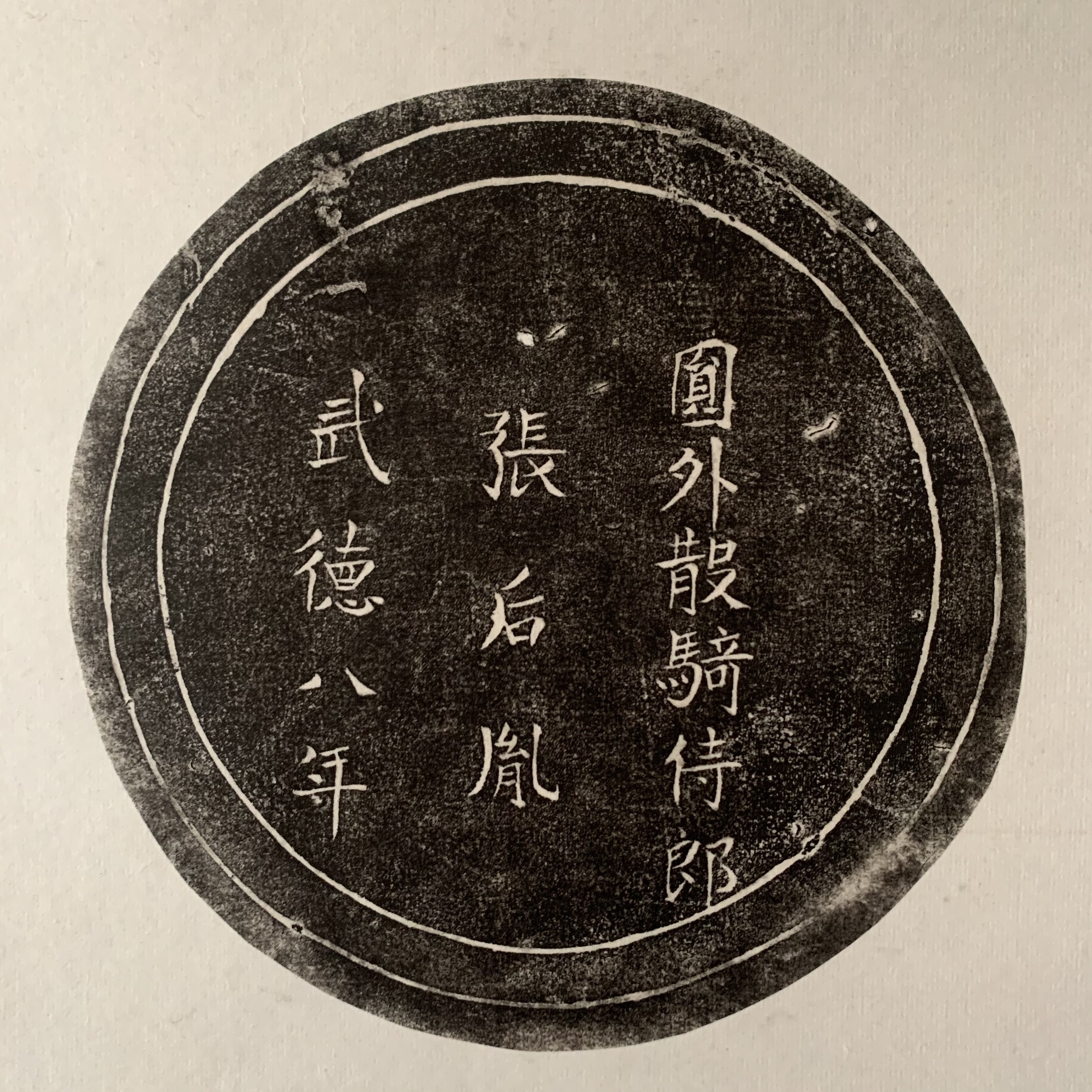 该帝师砚的背面铭有款识:“员外散骑侍郎,张后胤,武德八年。”武德八年,就是公元625年,是唐高祖李渊的年号。关于张后胤的官职,史书上多有明确的记载。据《新唐书·张后胤传》记载:“高祖镇太原,引为客,以经授秦王。义宁初,为齐王文学,封新野县公。武德中,擢员外散骑侍郎”。可见,员外散骑侍郎是武德年间唐高祖给张后胤加的官,后来唐太宗就实授他散骑侍郎。《旧唐书》中也有明确记载。想必张后胤自己对这个官位很是自豪,故铭款于此砚。除文字的传述之外,把摩这方古砚,我们得以仰望前贤非同一般的气魄。虽叹逝者如斯,也感豪气长存。