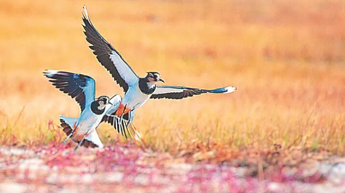 喇嘛甸湿地上两只凤头麦鸡比翼齐飞。图片来源:黑龙江日报