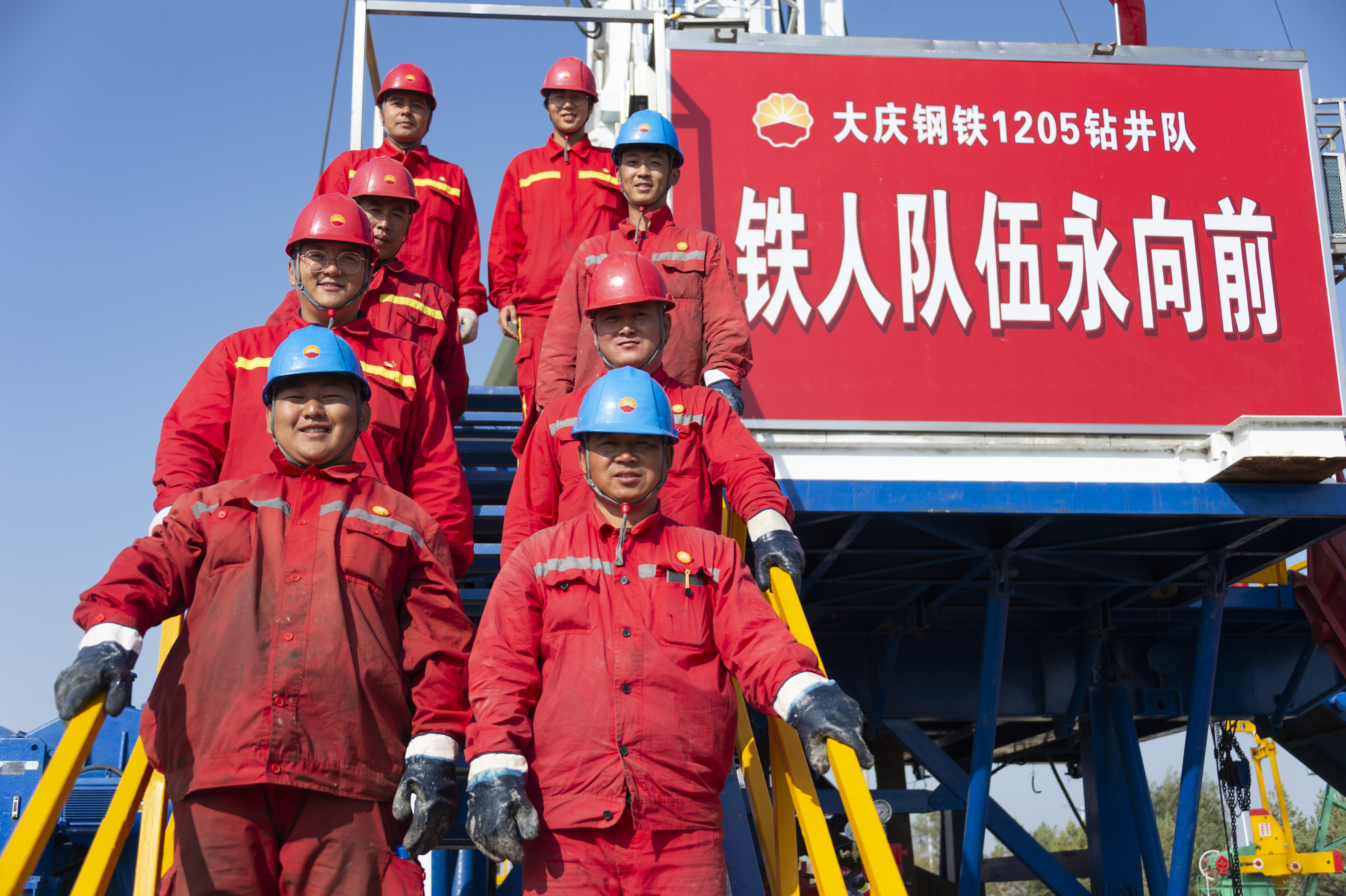 大庆油田1205钻井队的部分队员在钻井平台上合影(2019年9月28日摄)。1205钻井队是王进喜带过的队伍,是铁人精神发源地。新华社发(谢剑飞摄)