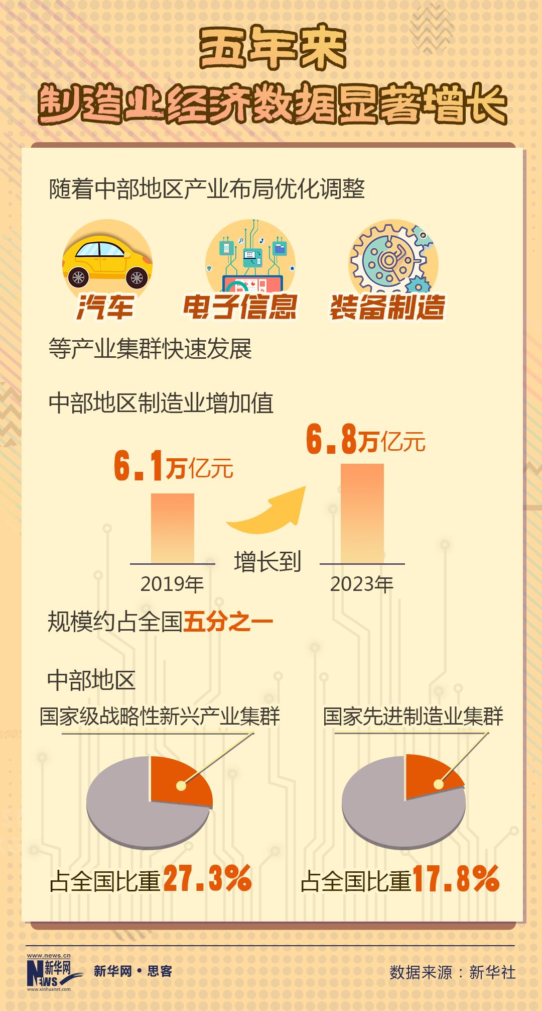 创新蓄积起澎湃的发展势能。2019年至2023年,中部地区生产总值由21.8万亿元增长到27万亿元,河南、湖北、湖南经济总量位列全国前十。