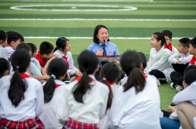 江苏省兴化市检察院未成年人法治宣讲团的工作人员走进兴化市文峰小学,通过讲故事的方式给学生讲解网络安全知识。新华社照片(2023年9月14日)周社根 摄