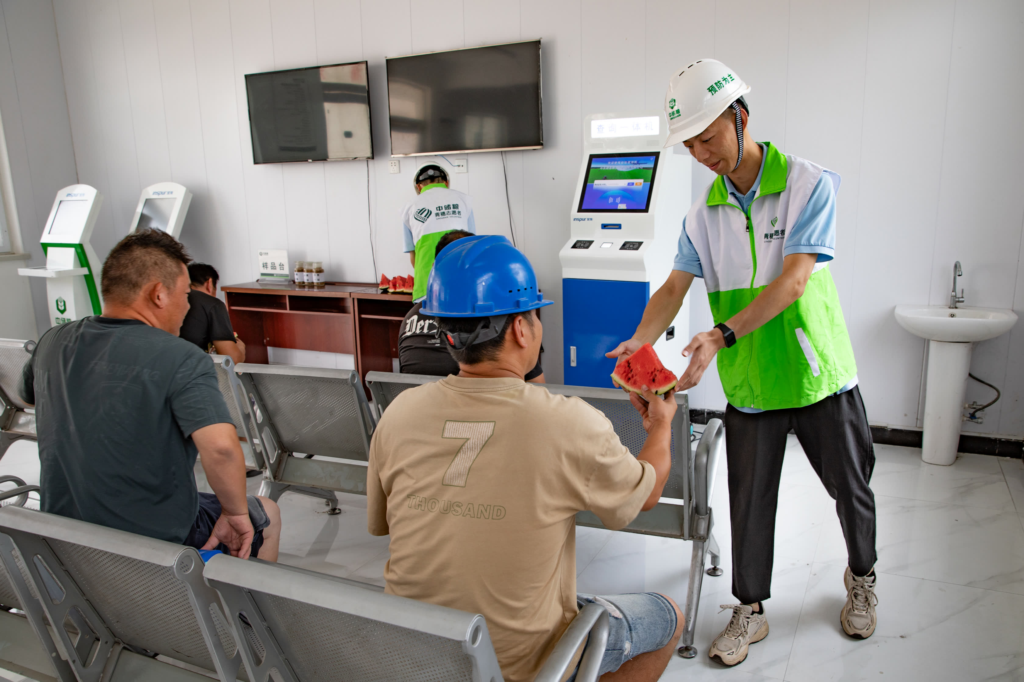 6月18日,在中储粮沈丘直属库“爱心服务站”内,工作人员正在为前来售粮的农户发放水果降温,做好夏粮收购的服务保障工作。新华网 姚远 摄