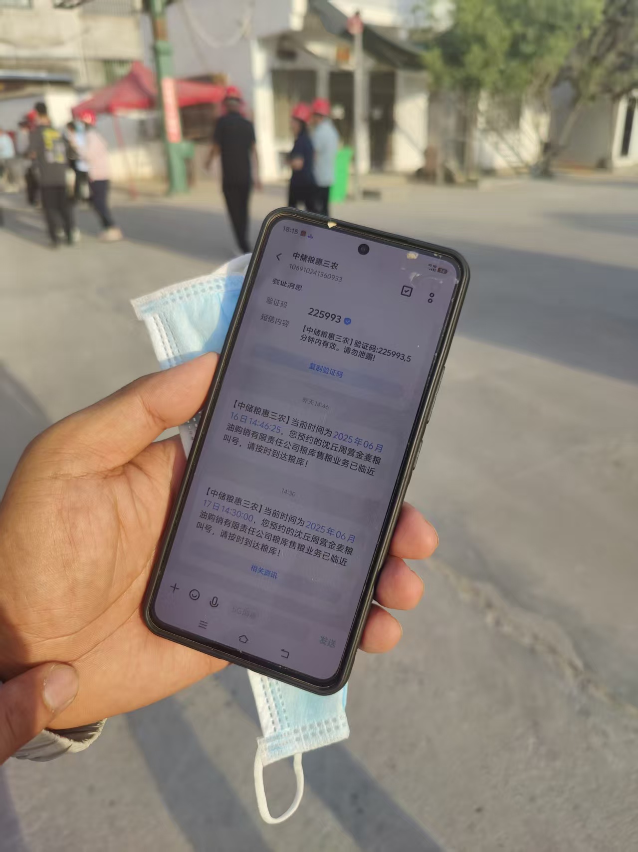 6月17日,在河南沈丘周营金麦粮油购销有限责任公司收储点,售粮农户为记者展示在“惠三农”APP预约成功后的短信消息。新华网 李然 摄
