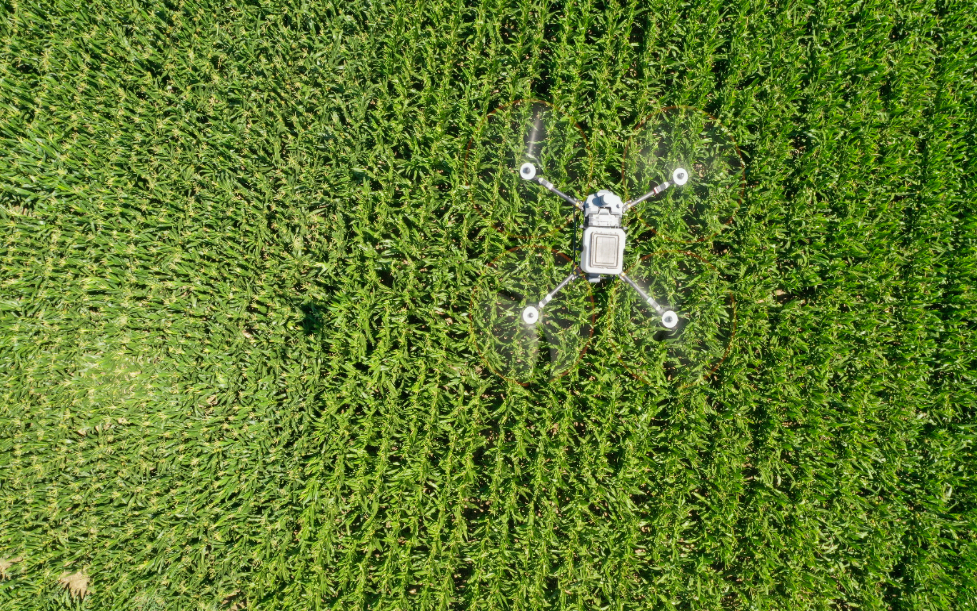 7月21日,在位于吉林省四平市梨树县的“科技小院”试验田,植保无人机为玉米精准施肥(无人机拍摄)。新华社记者 张楠 摄