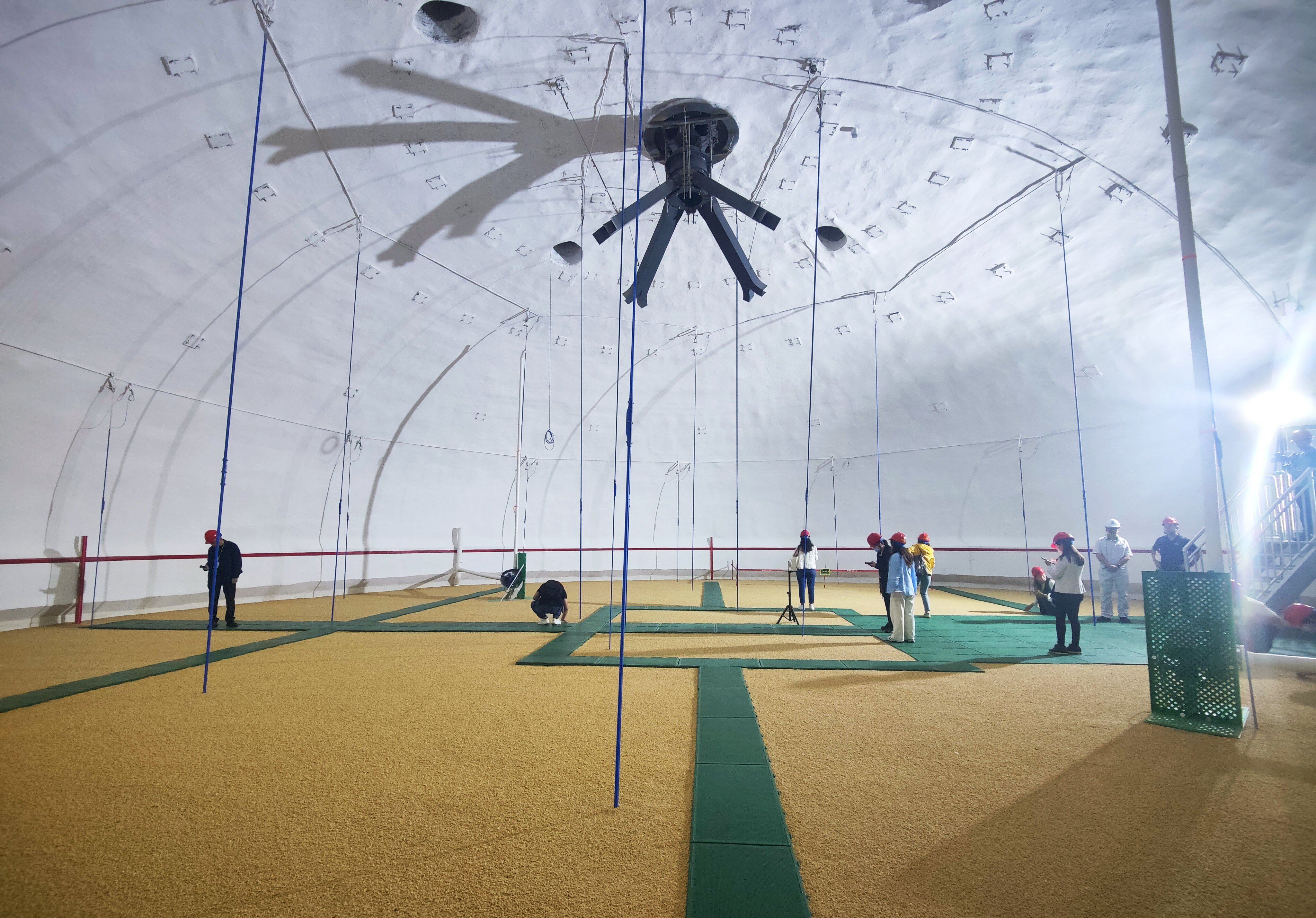 在粮食气膜仓内布有25根测温线缆,每隔5米一组,每组上下间隔1.85米的距离设置一个测温点,整仓共设置了350个温度检测点。这些测温电缆深入到粮堆底部,构成了一个遍布粮仓的立体测温网。