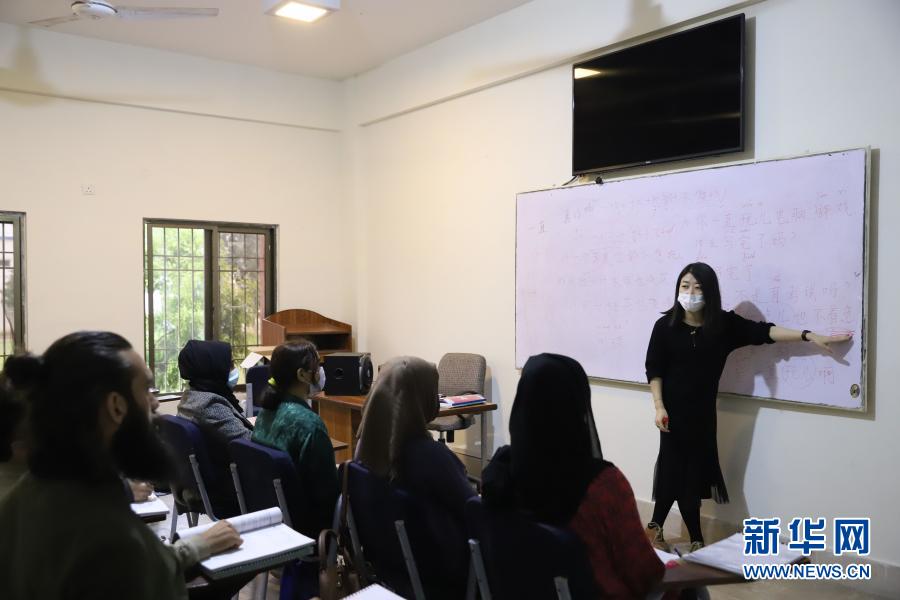 3月11日,在巴基斯坦伊斯兰堡,一名伊斯兰堡孔子学院中方教师在国立现代语言大学校园内教授汉语课。新华社记者 李浩 摄