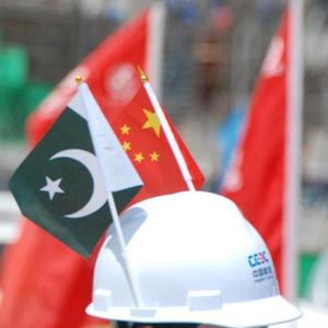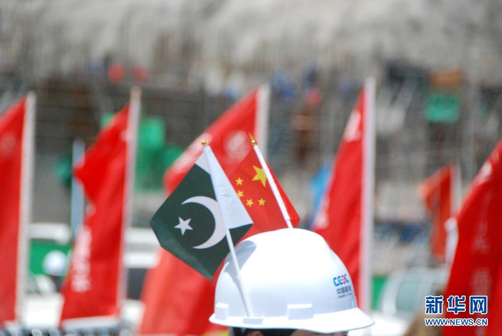 这是4月30日在巴基斯坦曼塞赫拉苏吉吉纳里水电站大坝二期截流仪式现场拍摄的中国和巴基斯坦国旗。新华社记者 邓凯尹 摄